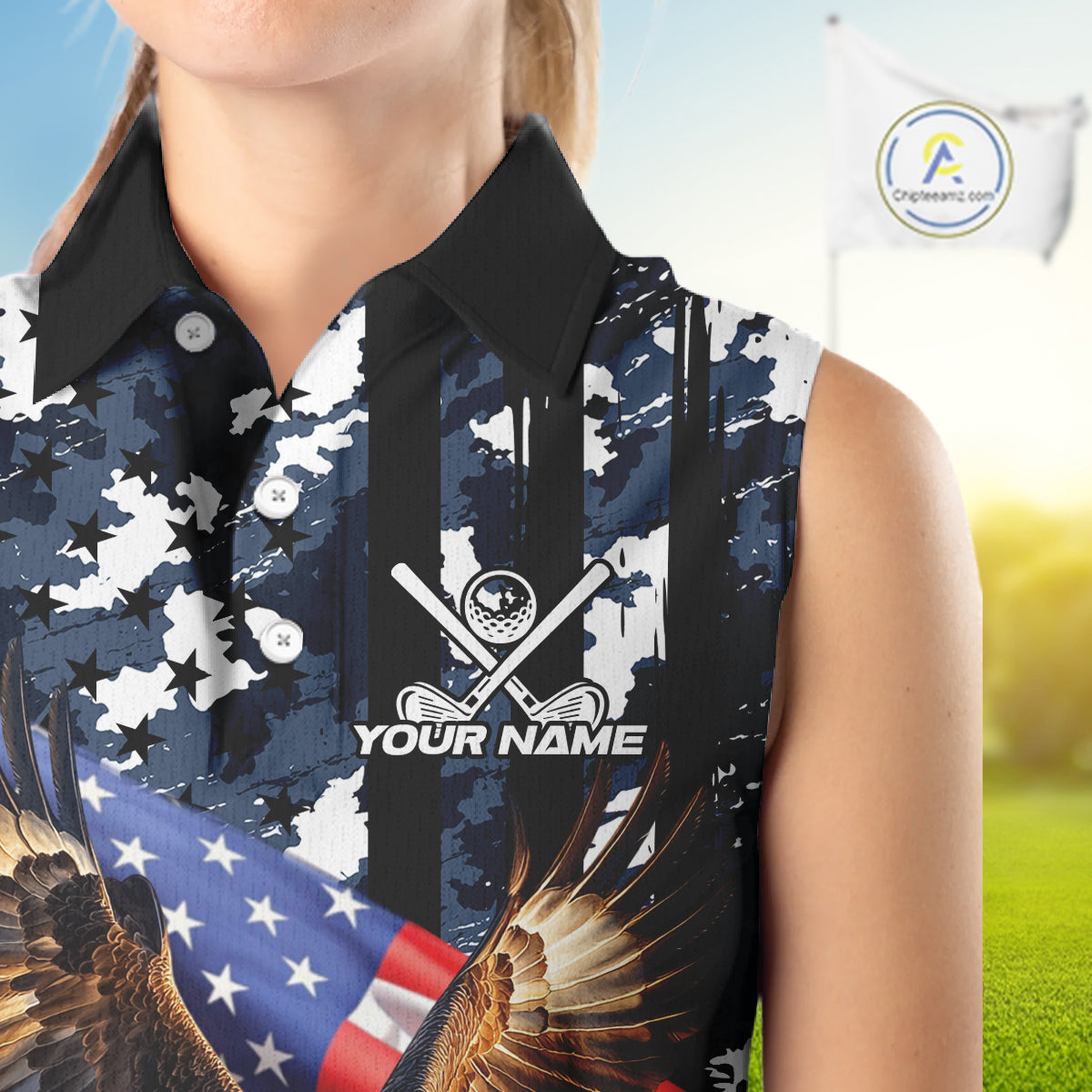 Blue Camo American Flag Eagle Flame Sleeveless polo Shirt Custom Patriotic Team Ladies Golf Outfit NQS10552