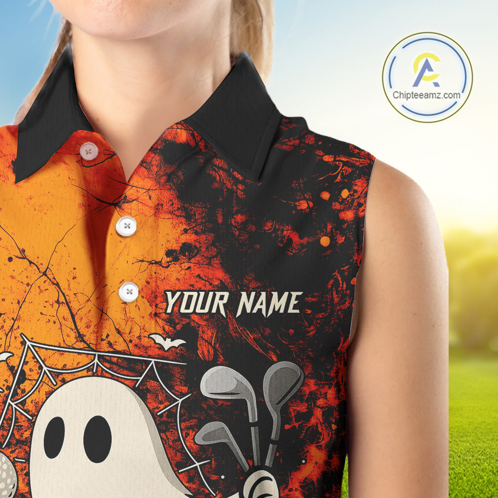Custom Orange Halloween Boo Sleeveless polo shirt for Women, Halloween Ladies Golf Outfits NQS10524