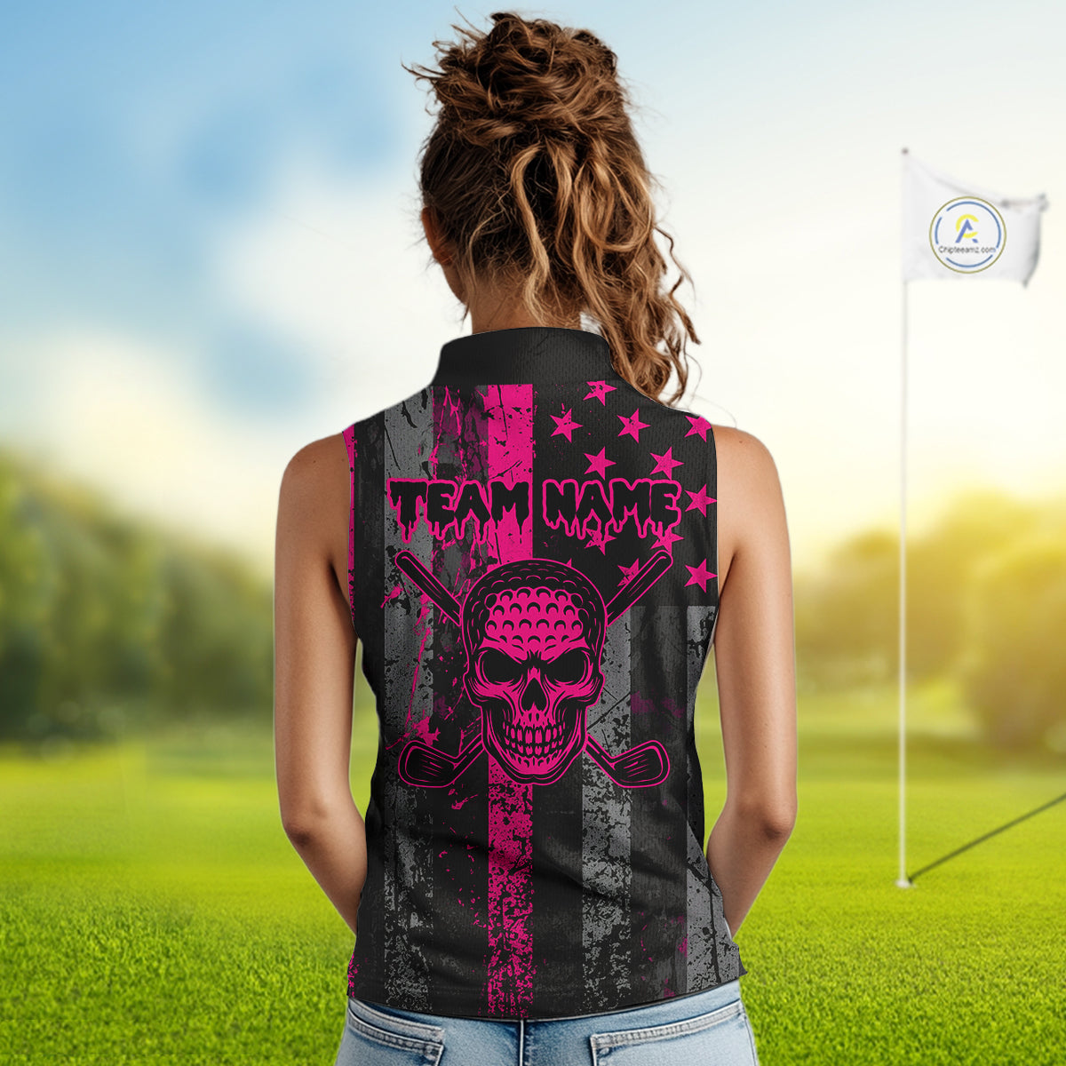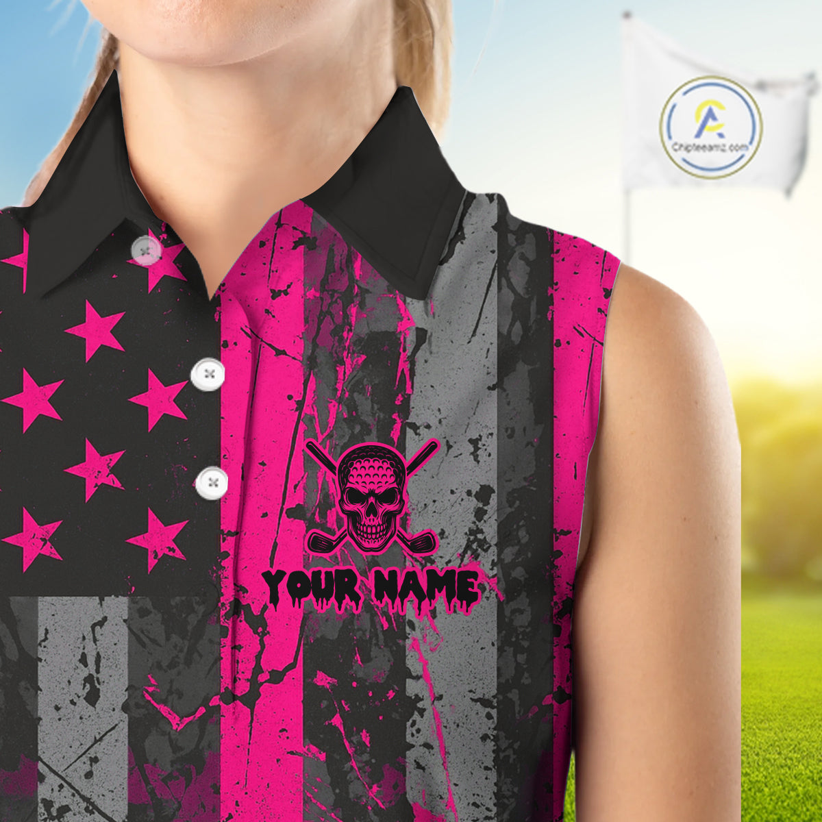 Custom Pink Grunge American Flag Patriotic Skull Sleeveless Golf Polo Shirt, Retro Golf top NQS10482