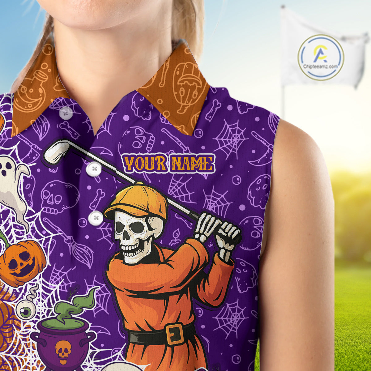 Halloween Skull Playing Golf Sleeveless Polo Shirt Custom Halloween golf outfit For Ladies Golf Gifts NQS10340