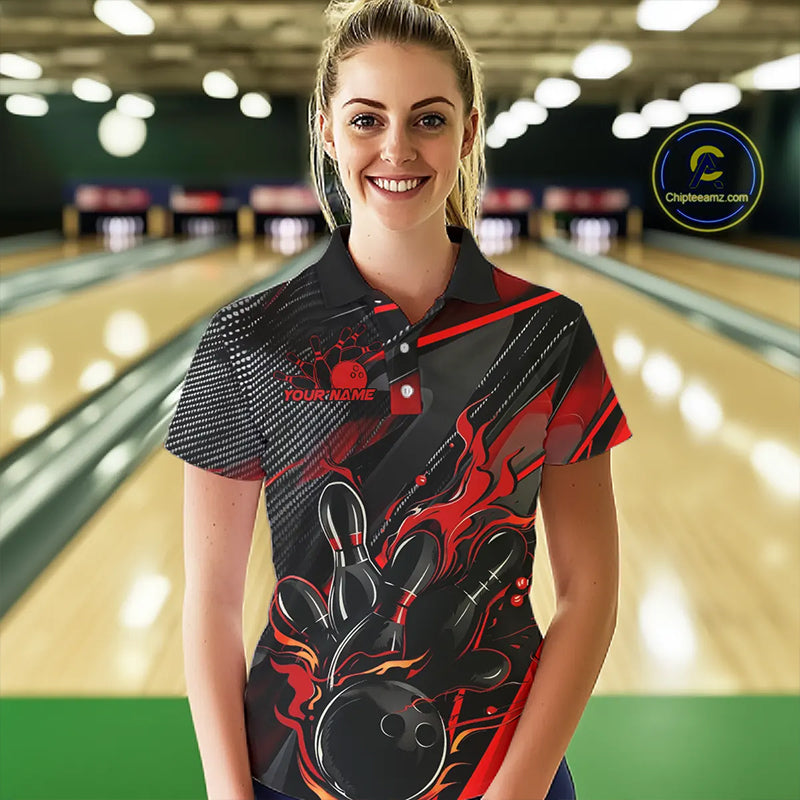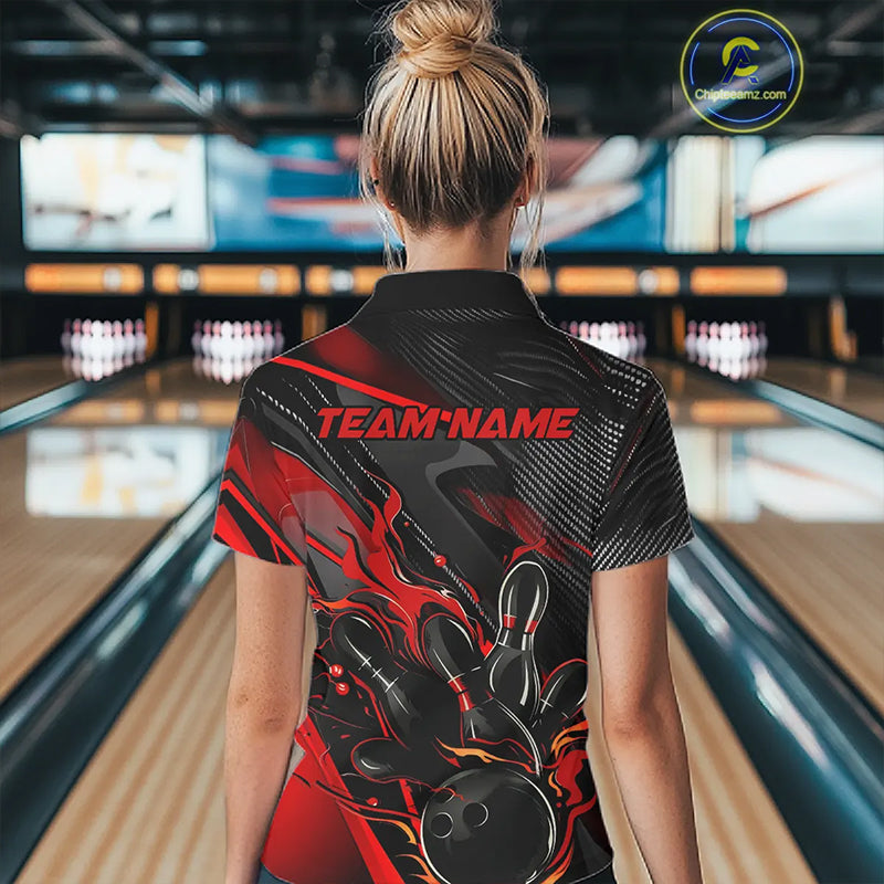 Black And Red Custom Flame Bowling Shirts For Women, Fire Bowling Team Shirt Bowler Jersey IPHW7931
