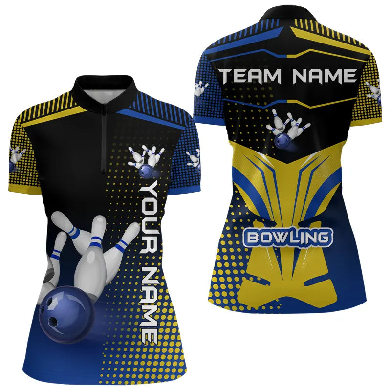 Yellow & Blue pattern Bowling Polo, 1/4 Zip shirt For Women Custom Team Bowling Jersey,Gift For Bowler NQS9212