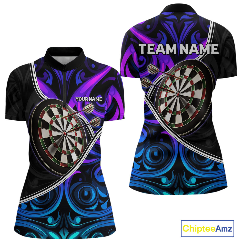 Neon Purple Blue Tribal Pattern Dart Shirts For Women Custom Dart Jerseys Team Polo & Quarter Zip TDM3823