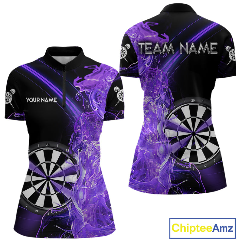 Custom Black And Purple Flame Darts Shirts For Women, Darts Team Jerseys Polo & Quarter Zip Uniform TDM4017
