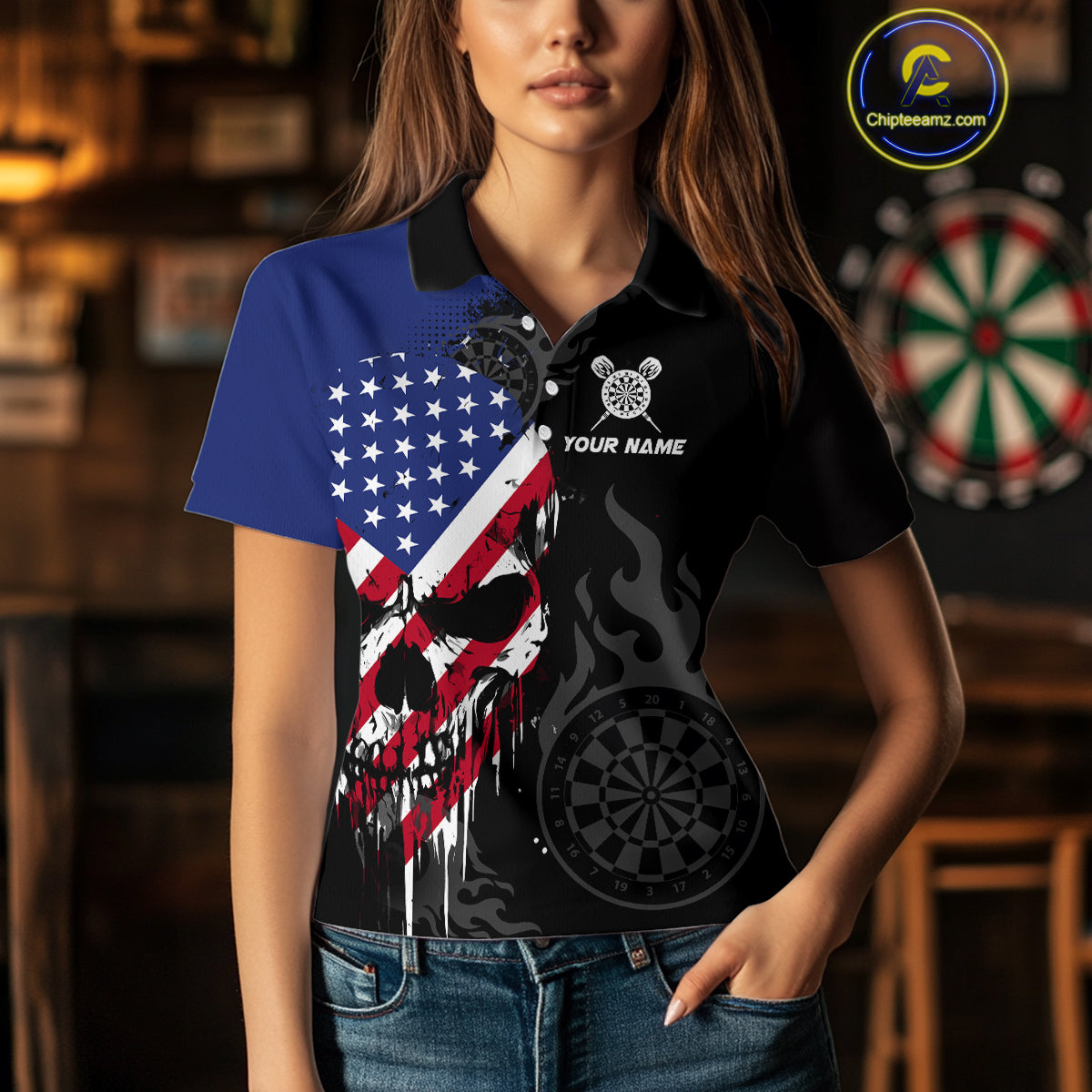 Grunge American Flag Skull Darts Shirt For Women Custom Patriotic Darts Team Jerseys Polo & 1/4 Zip TDM4197