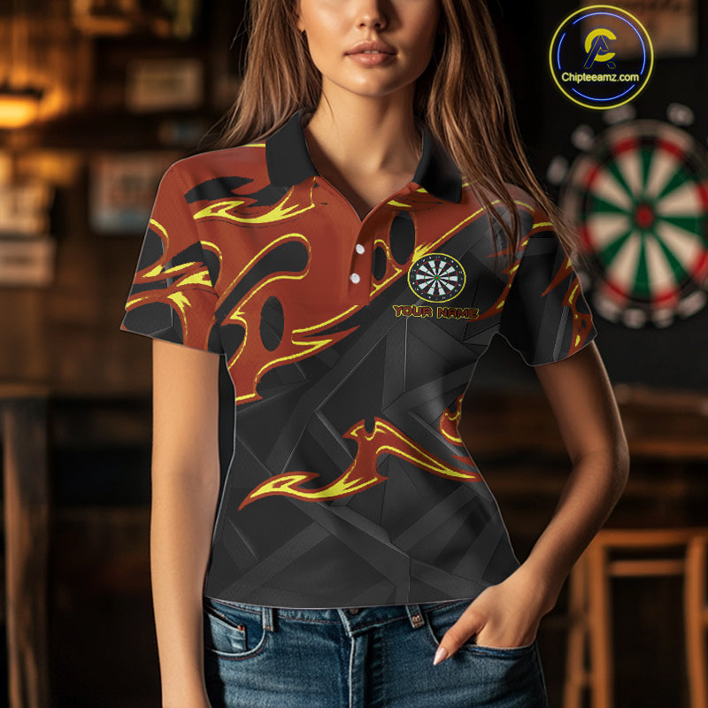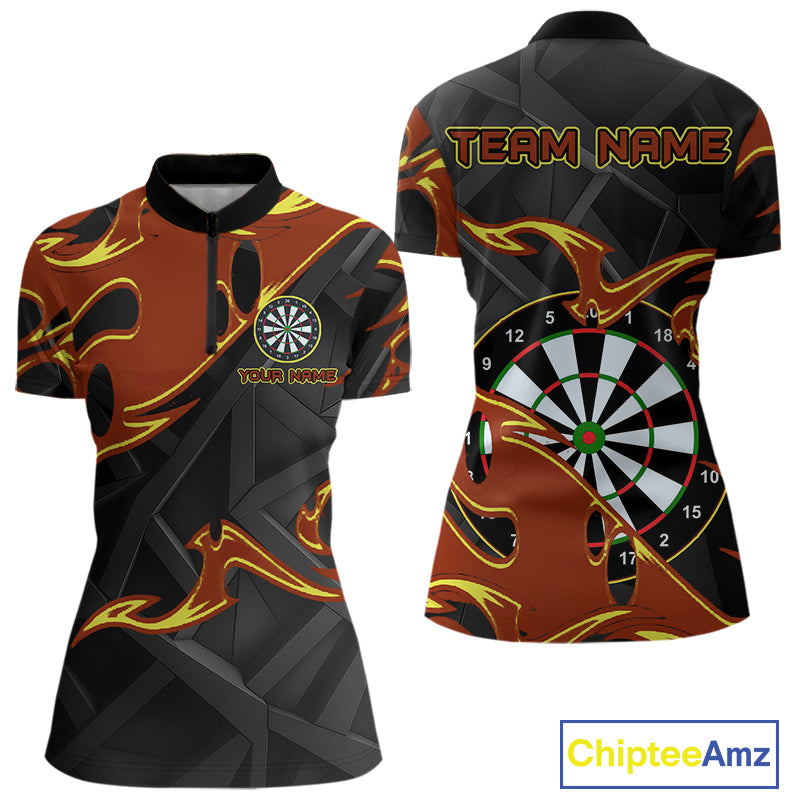 Custom Black And Orange Tribal Flame Dart Shirts For Women, Darts Team Jerseys Polo & Quarter Zip TDM4285