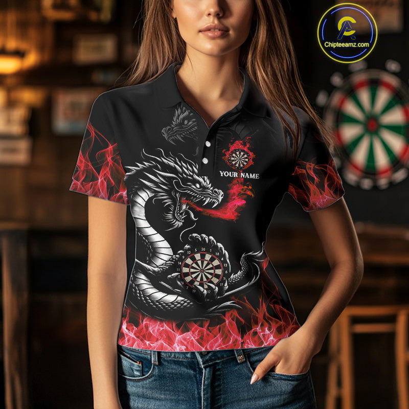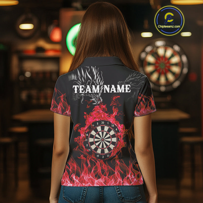 Personalized Red Flaming Dragon Dart Shirts For Women Custom Darts Team Jerseys Polo & Quarter Zip TDM4310