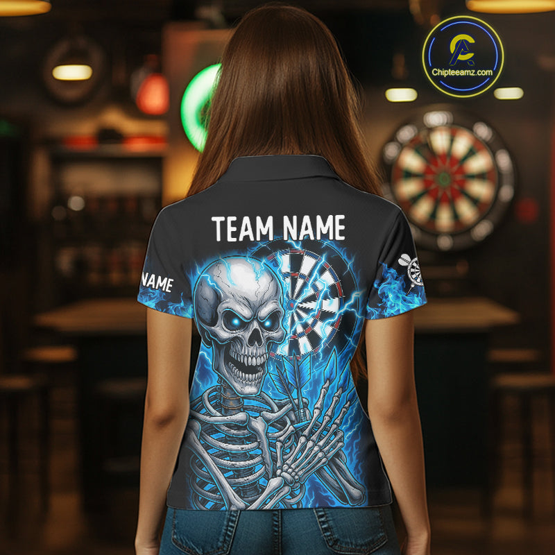 Blue Flaming Lightning Skeleton Darts Shirt For Women Custom Darts Jersey Team Polo & Quarter Zip TDM4344