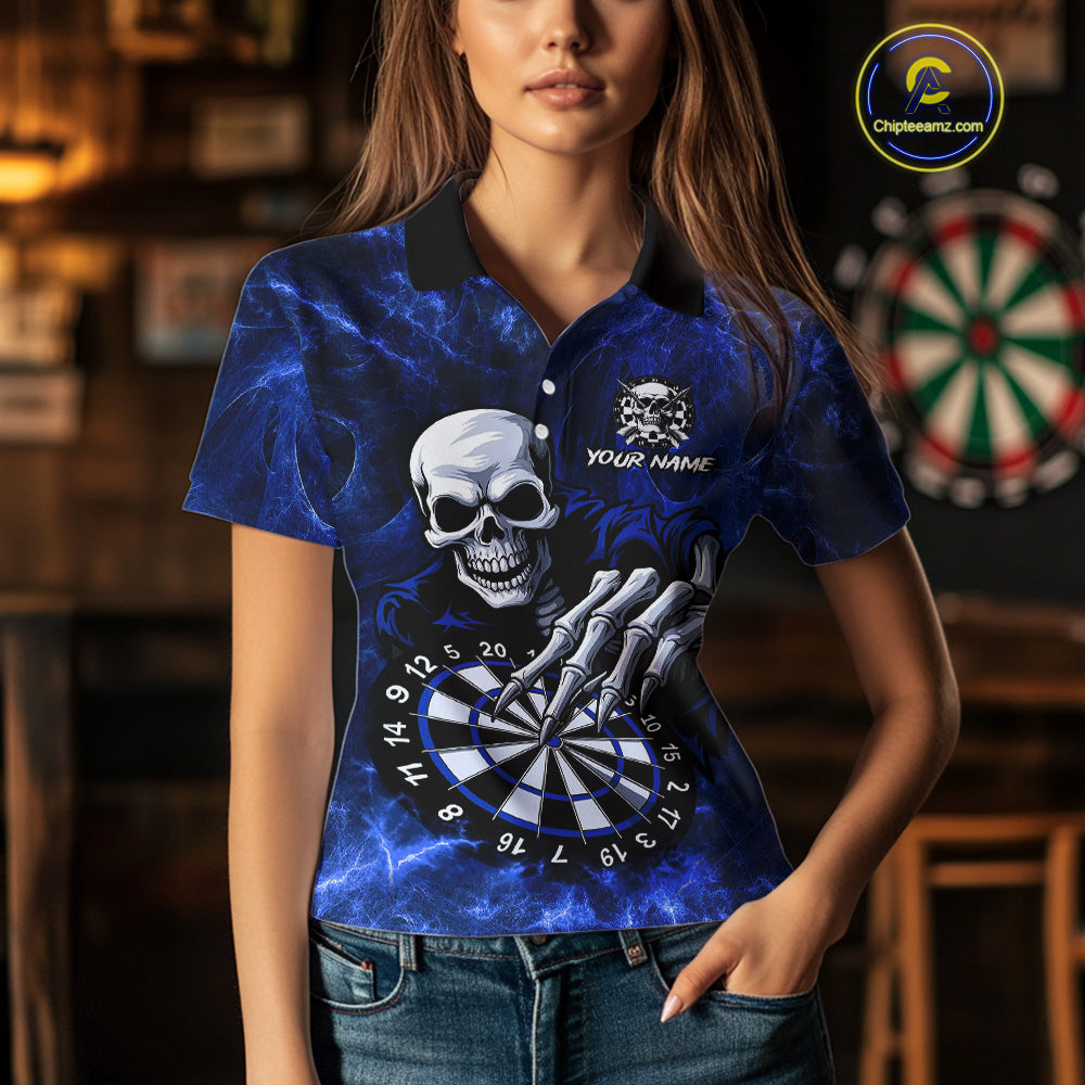 Personalized Blue Funny Skeleton Darts Shirt For Women Custom Skull Darts League Team Jersey TDM4397