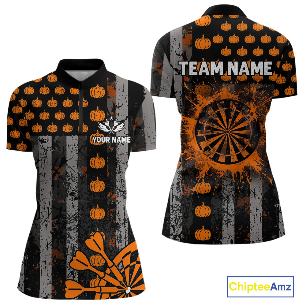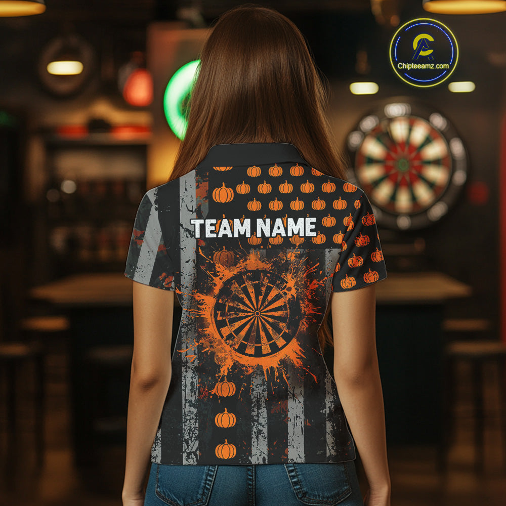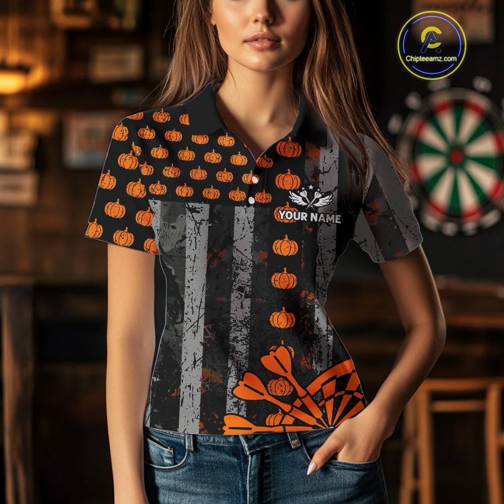 Personalized Orange Grunge US Flag Pumpkin Darts Shirt For Women, Halloween Darts Jersey Outfit TDM4502