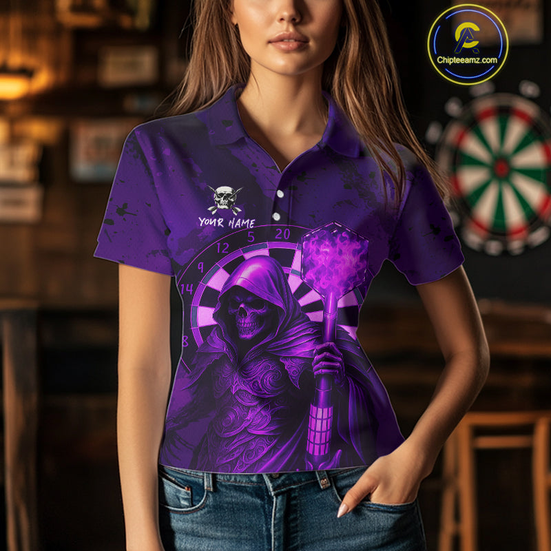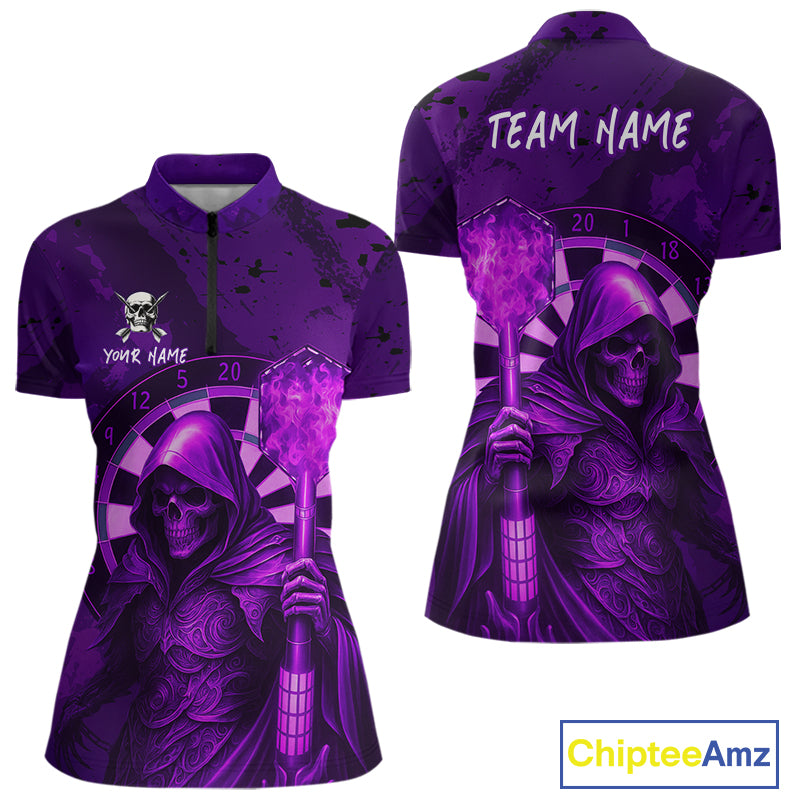 Personalized Purple Grunge Grim Reaper Darts Shirt For Women Custom 3D Darts Jersey Polo & 1/4 Zip TDM4742