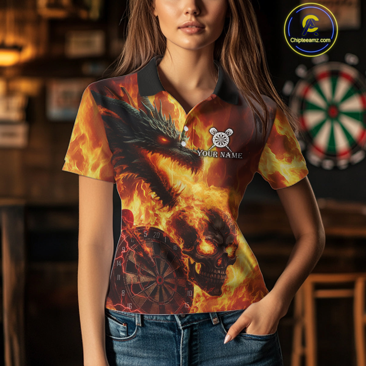 Personalized Orange Flaming Dragon And Skull Darts Shirt For Women Custom 3D Fire Darts Team Jersey TDM4958