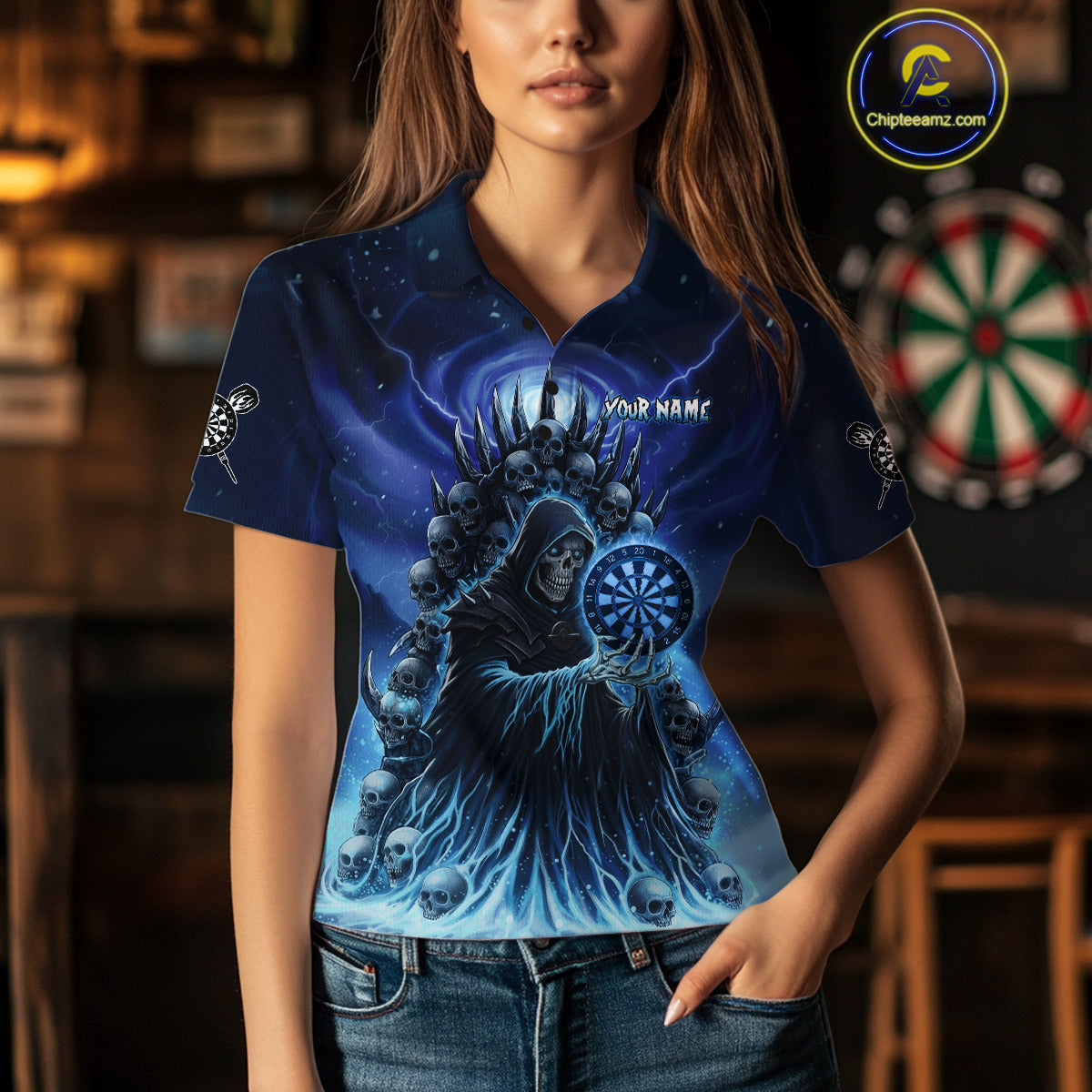 Personalized Blue Grim Reaper Darts Jersey For Women Custom Skull Dart Team Polo & Quarter Zip Shirt TDM5058