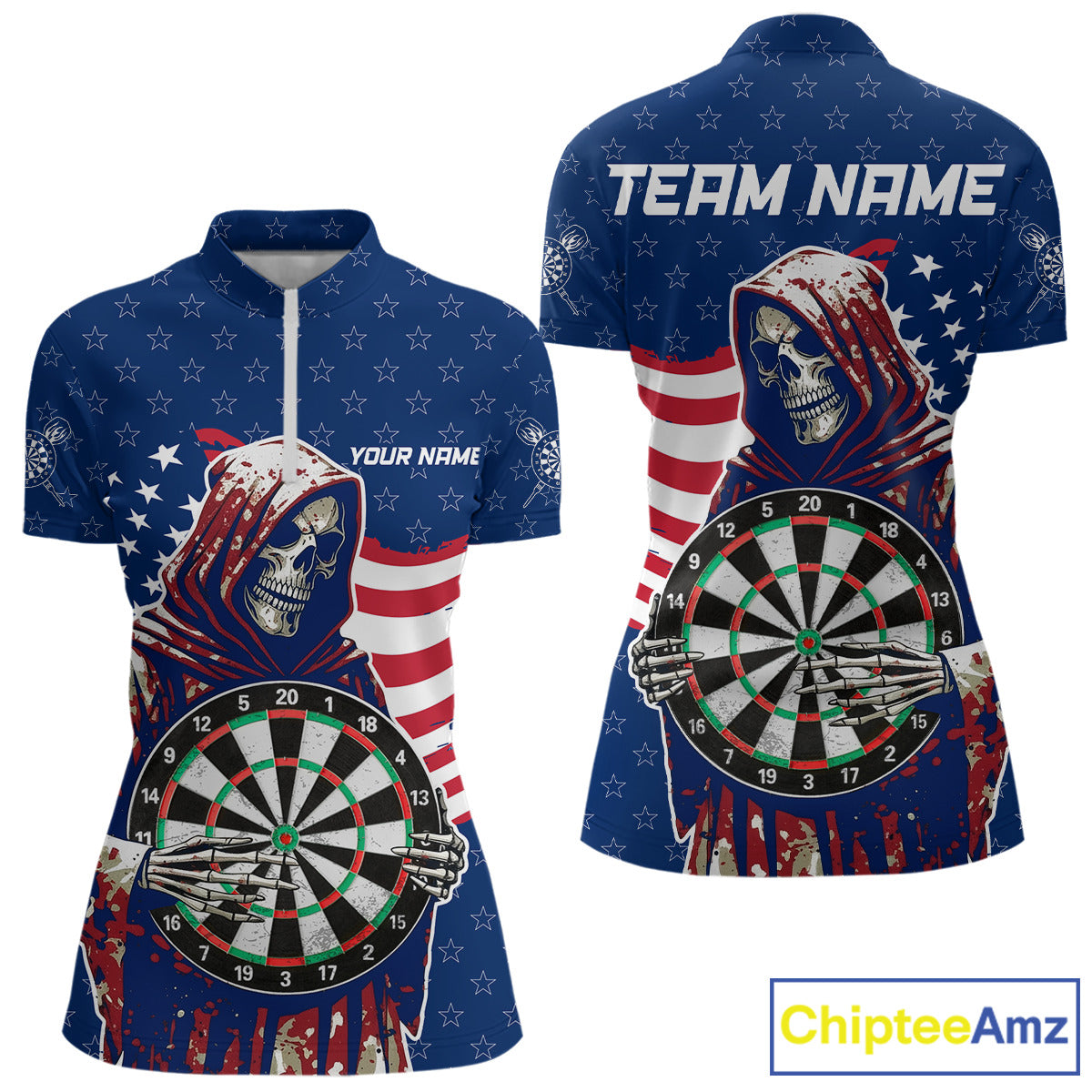 American Flag Grim Reaper Darts Shirt For Women Custom Patriotic Darts Jersey Team Polo & 1/4 Zip TDM5148