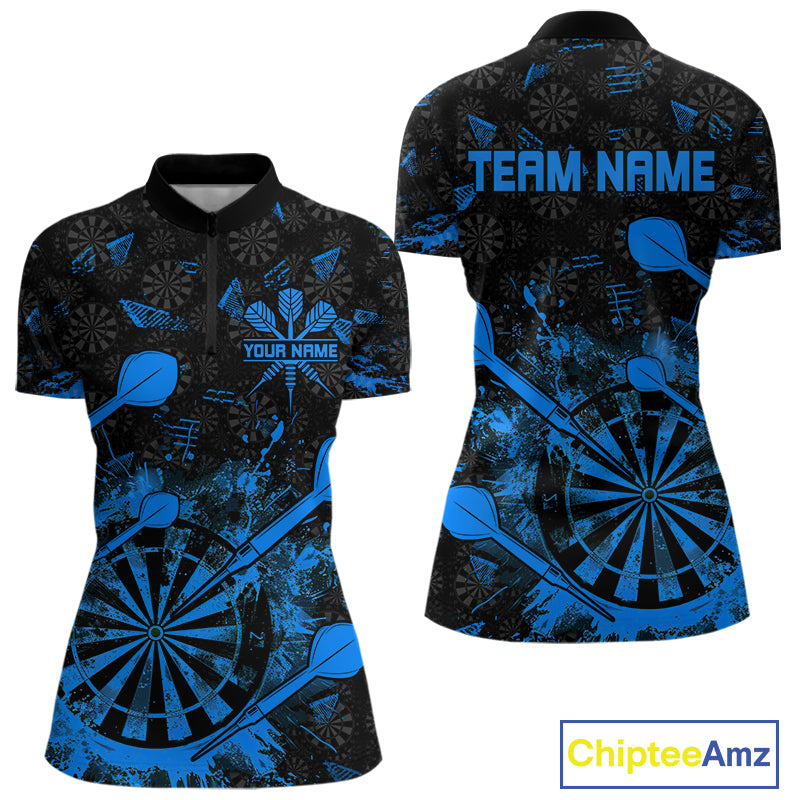 Black And Blue Grunge Darts Polo, Quarter Zip For Women Custom Dart Shirts For Team, Dart Jerseys TDM5153