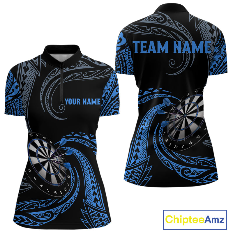 Personalized Blue Tribal Polynesian Womens Dart Shirts Custom Darts Polo & 1/4 Zip Team Jersey TDM5154