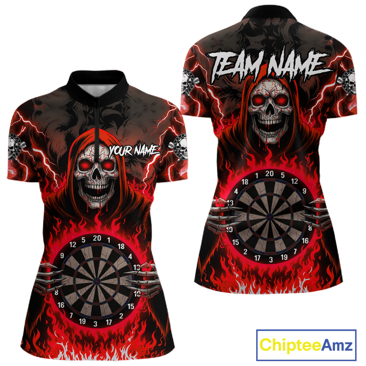 Red Grim Reaper Thunder Lightning Womens Dart Shirts Custom Flame Dart Jerseys Team Polo & 1/4 Zip TDM5175