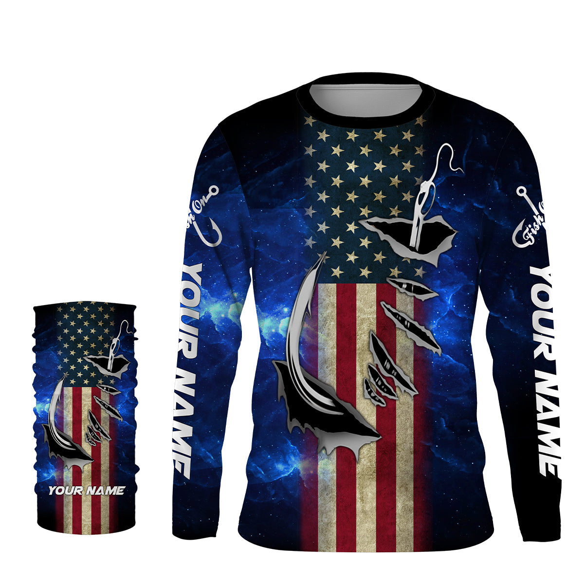 American flag fish hook blue galaxy fishing Custom Name UV Protection performance fishing Shirts NQS3024