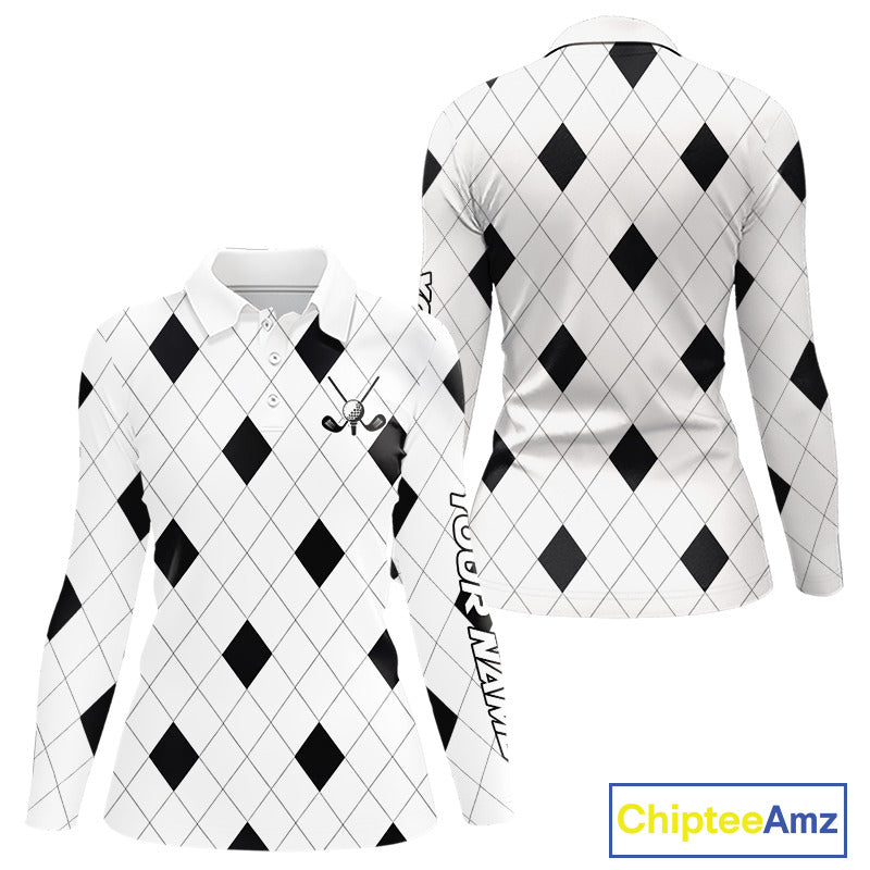 Argyle Womens Long Sleeve Golf Polo Shirt Custom Name, Personalized Plaid Golf Shirts For Ladies NHN0120