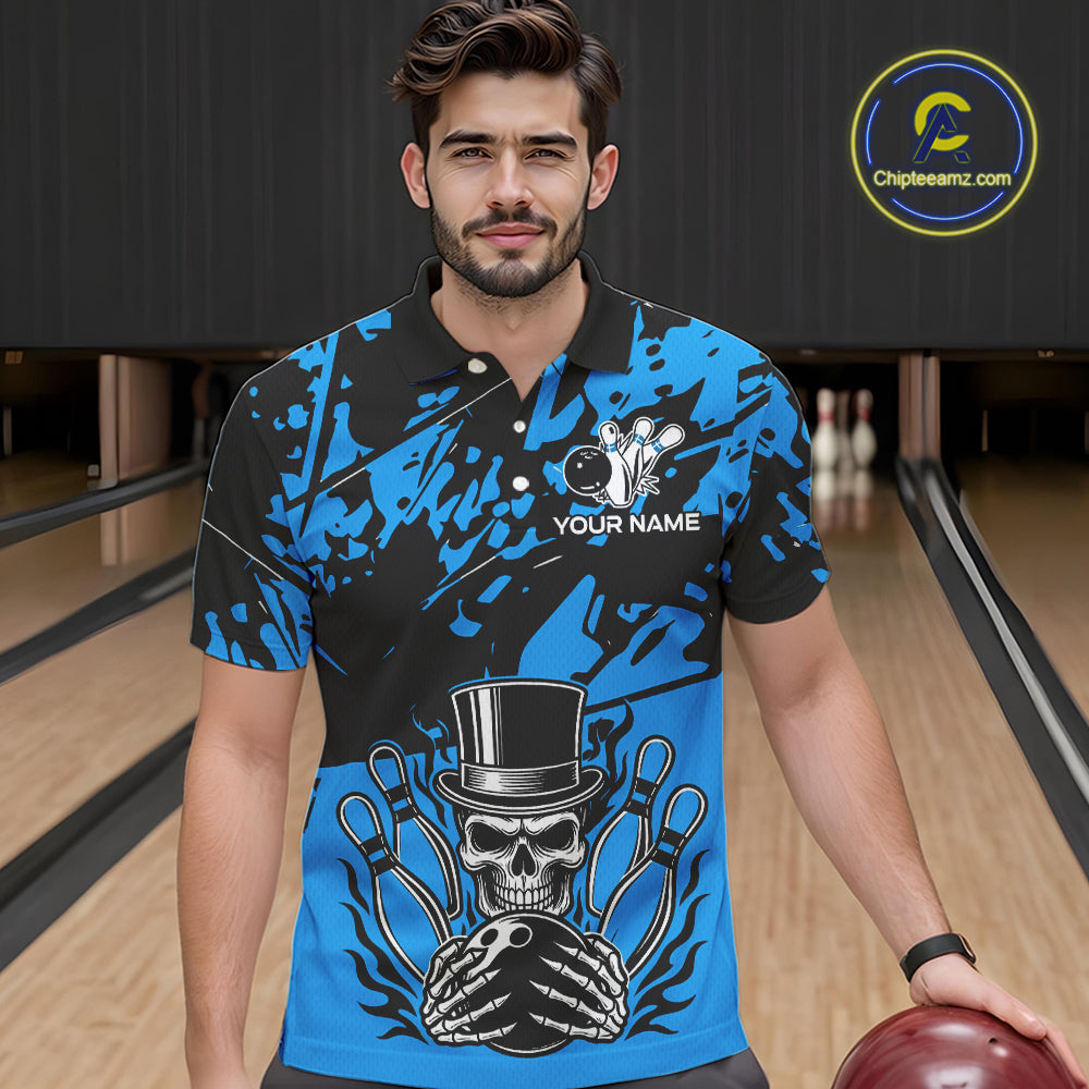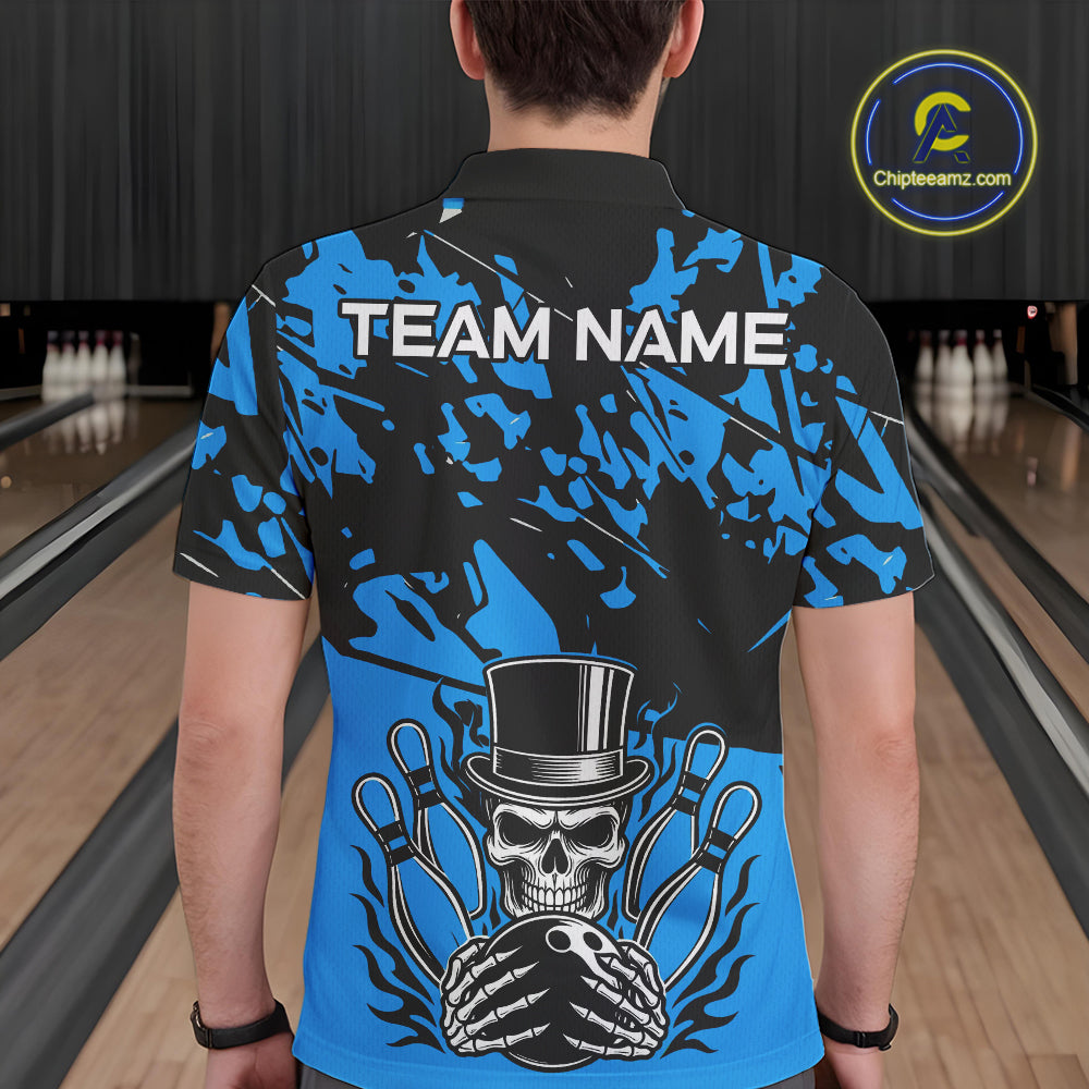 Black and Blue Camo Skull Bowling Polo, Quarter Zip Shirt for Men Custom Skull Team bowling jersey NQS10007