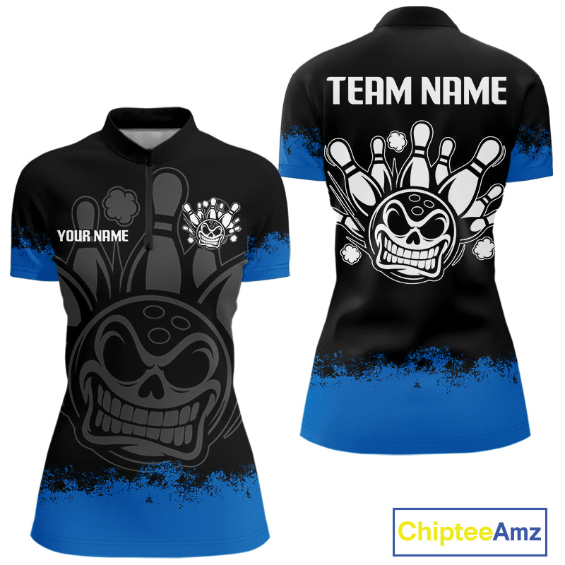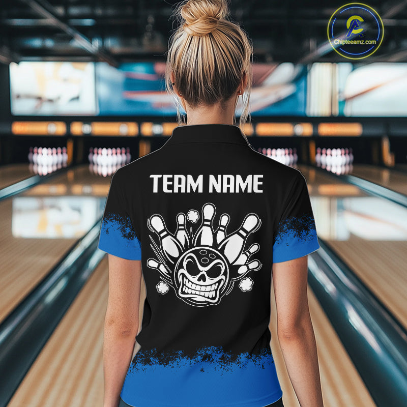 Black and Blue Funny Bowling Polo, Quarter Zip Shirt for Women Custom Bowling Team Jersey NQS9982
