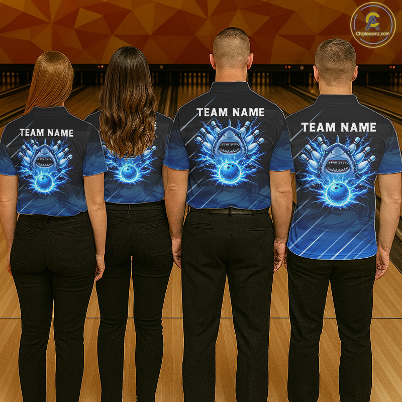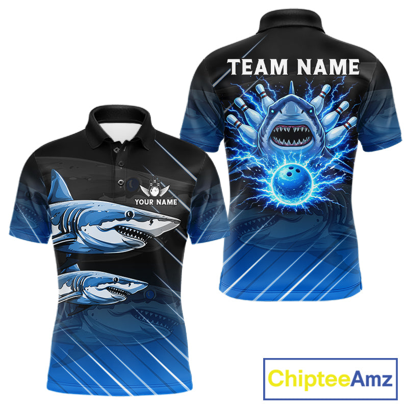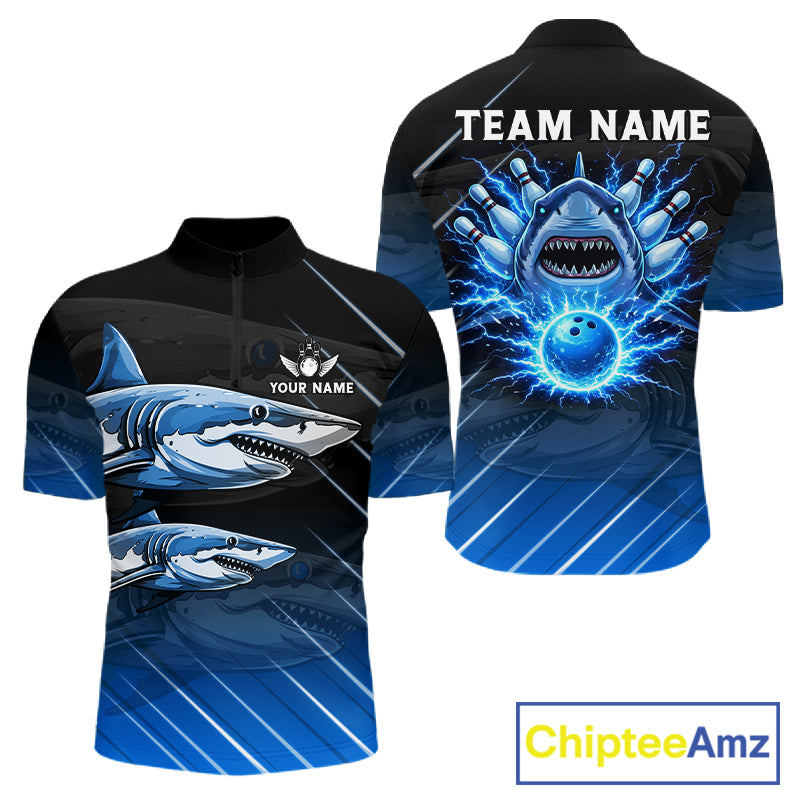 Black and blue shark bowling shirt for men custom lightning thunder bowling polo, quarter zip shirts NQS11378
