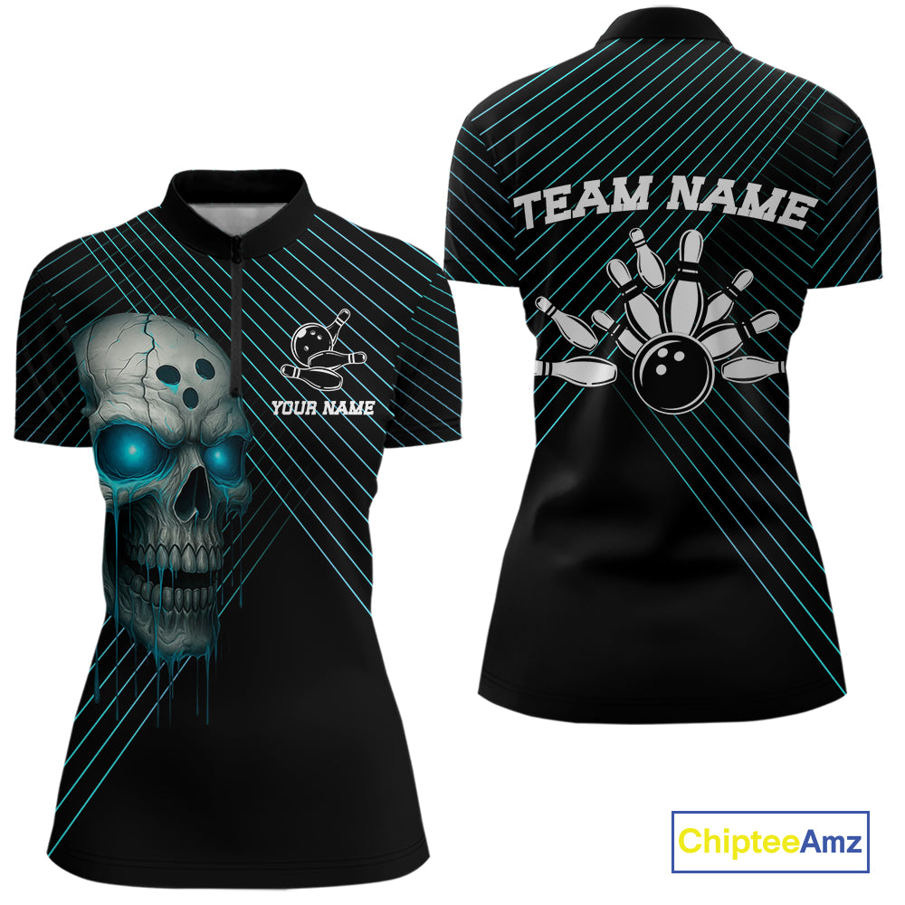 Black and Blue Skull Bowling Polo, Quarter Zip Shirts For Women Custom Bowling Team Jerseys Outfits NQS10171