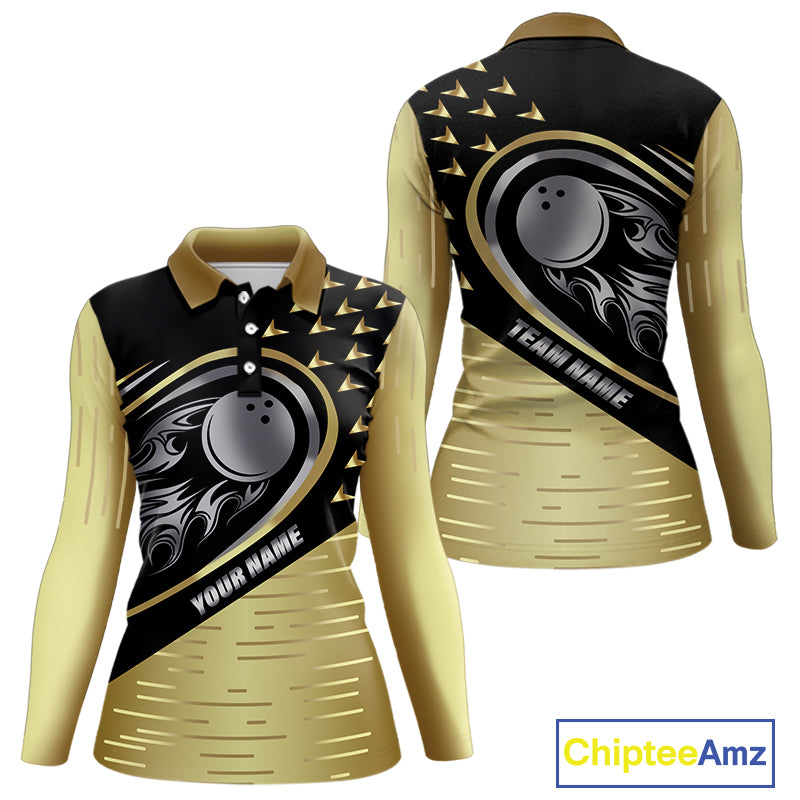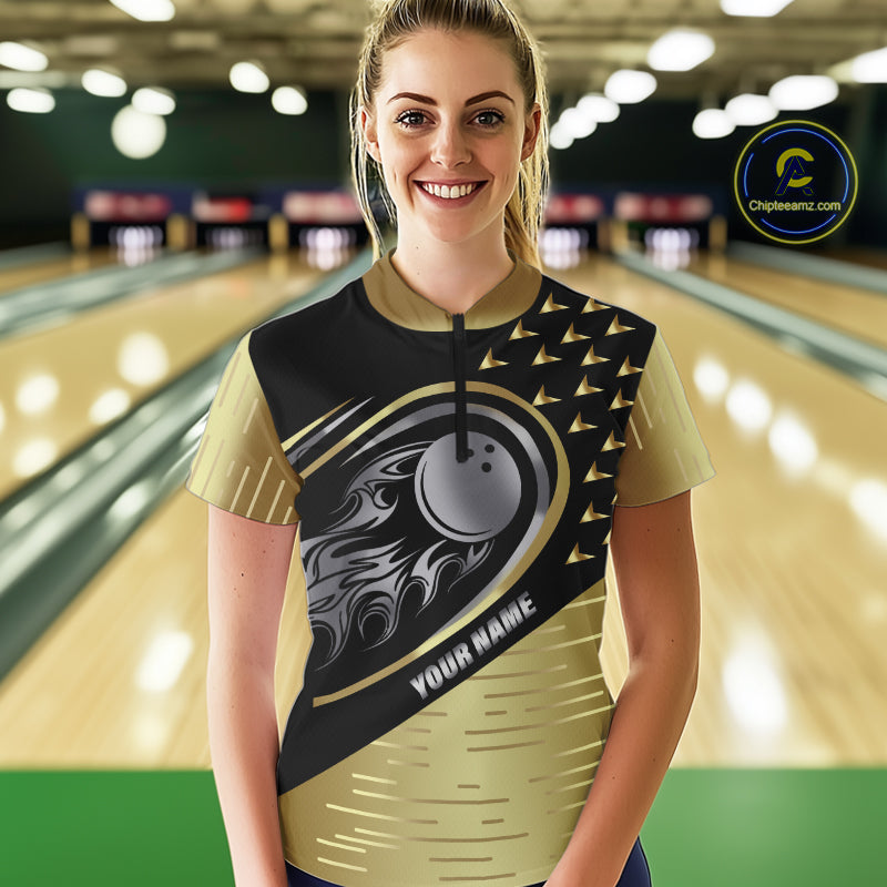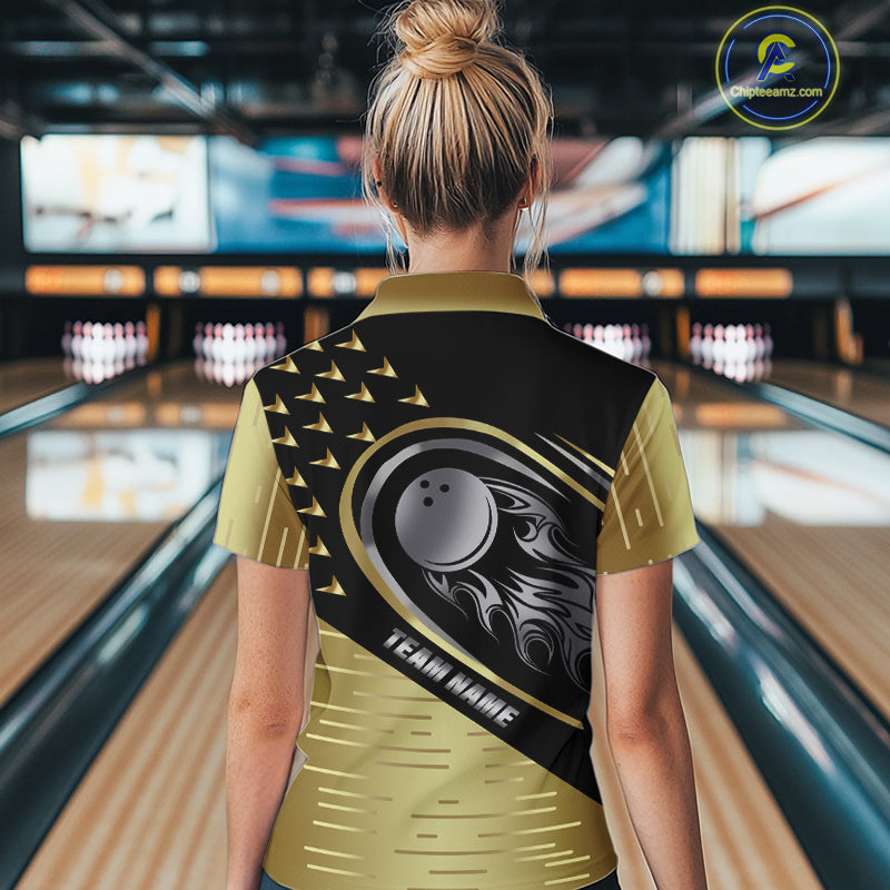 Black and Gold Flame Bowling ball Polo, Quarter Zip Shirts for Women Custom Bowling Team jerseys NQS10029