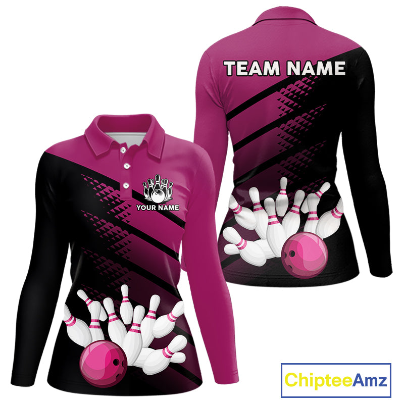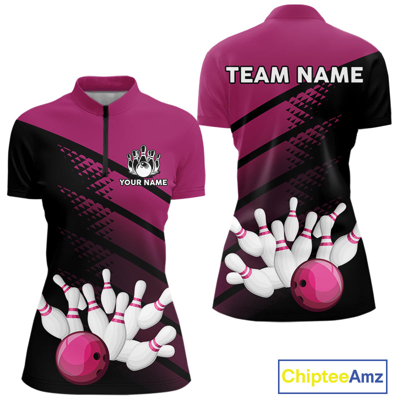 Black and Pink Bowling Polo, Quarter Zip shirts for Women Custom name bowling team league jerseys NQS10177