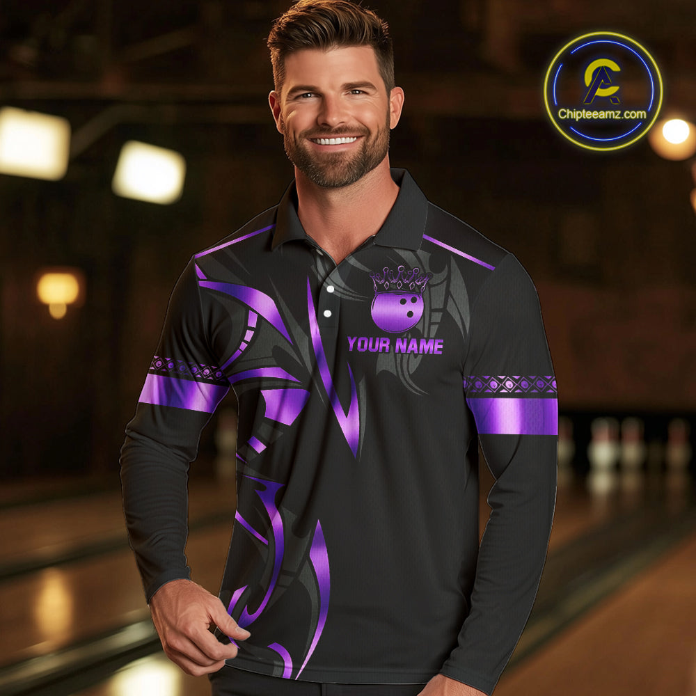 Black and Purple crown Bowling ball Polo, Quarter Zip Shirts for Men Custom Bowling Team jerseys NQS10046