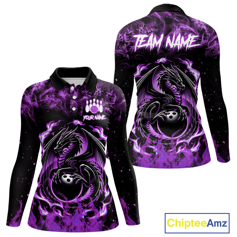 Black and Purple Flame Dragon bowling shirts for Women Custom Bowling Team Jersey, gift for Bowler NQS10247