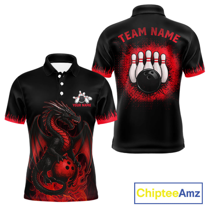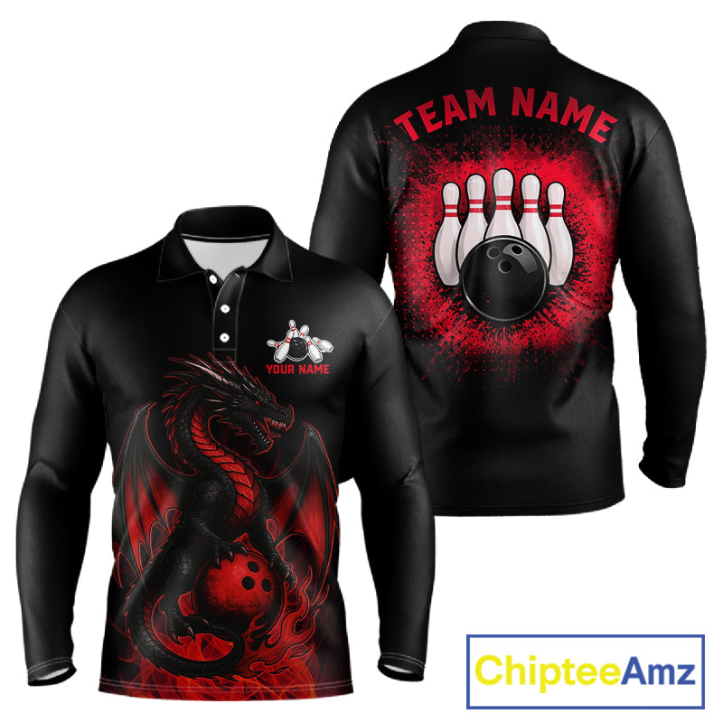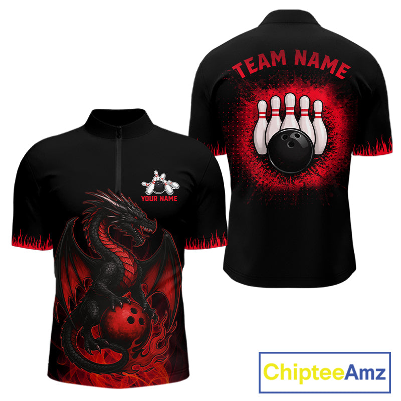Black and Red Flame Dragon Bowling Polo, 1/4 zip shirts for Men Custom Dragon team bowling jerseys NQS11482
