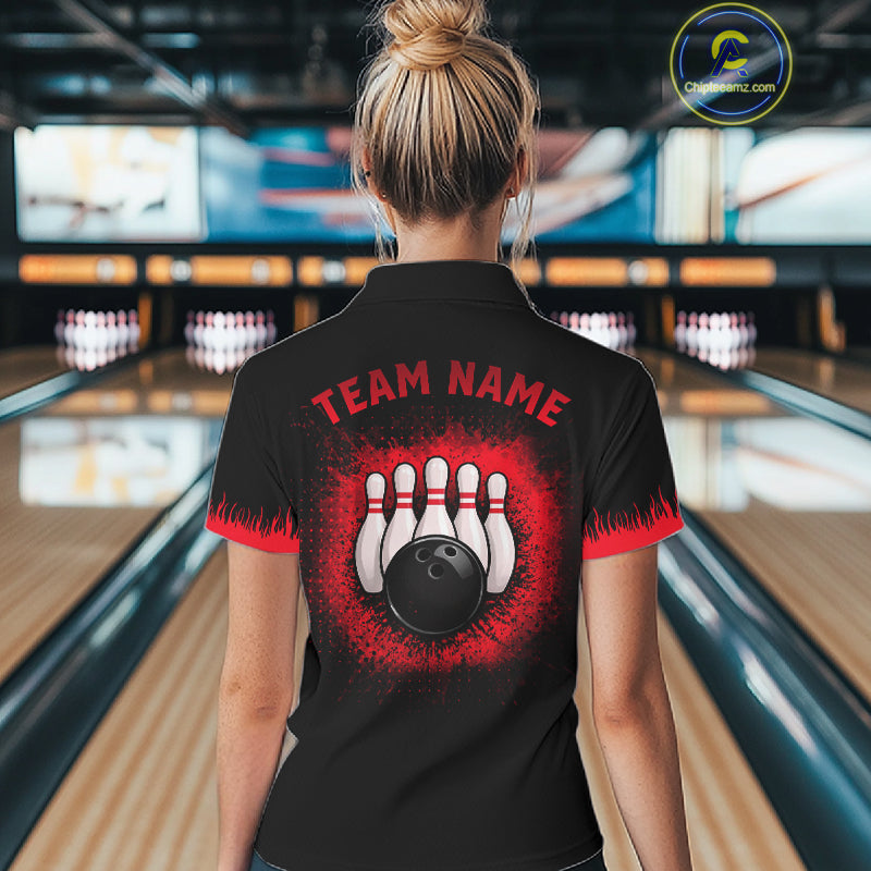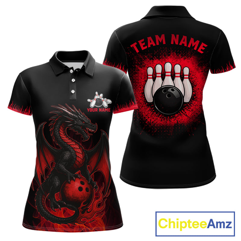 Black and Red Flame Dragon Bowling Polo, 1/4 zip shirts for Women Custom Dragon team bowling jerseys NQS11482