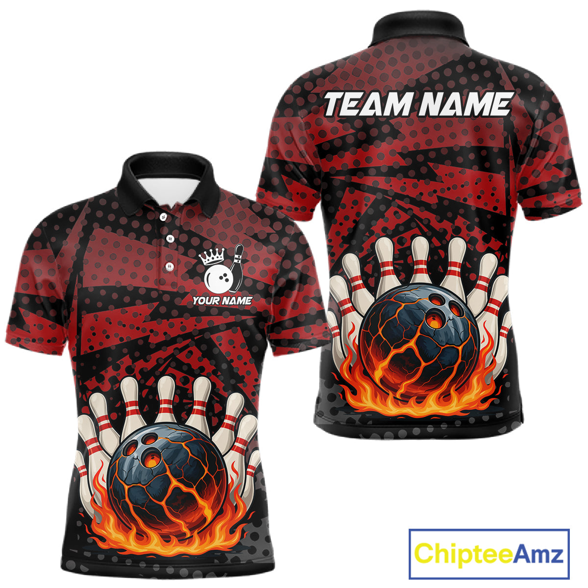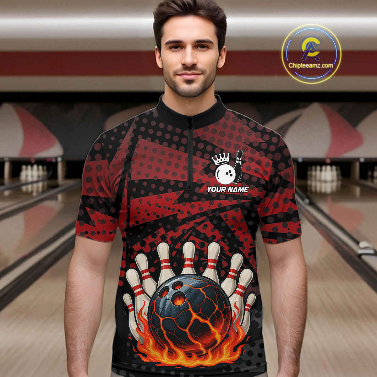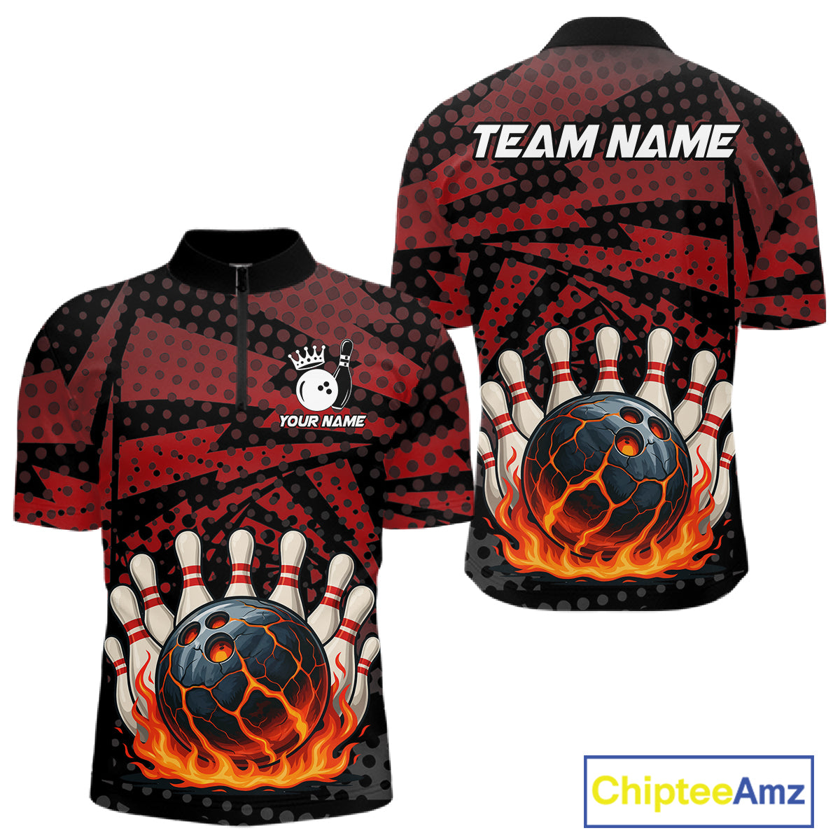 Black and Red pattern Flame Bowling Polo, 1/4 zip shirts For Men Custom Team Bowling Jerseys NQS11277