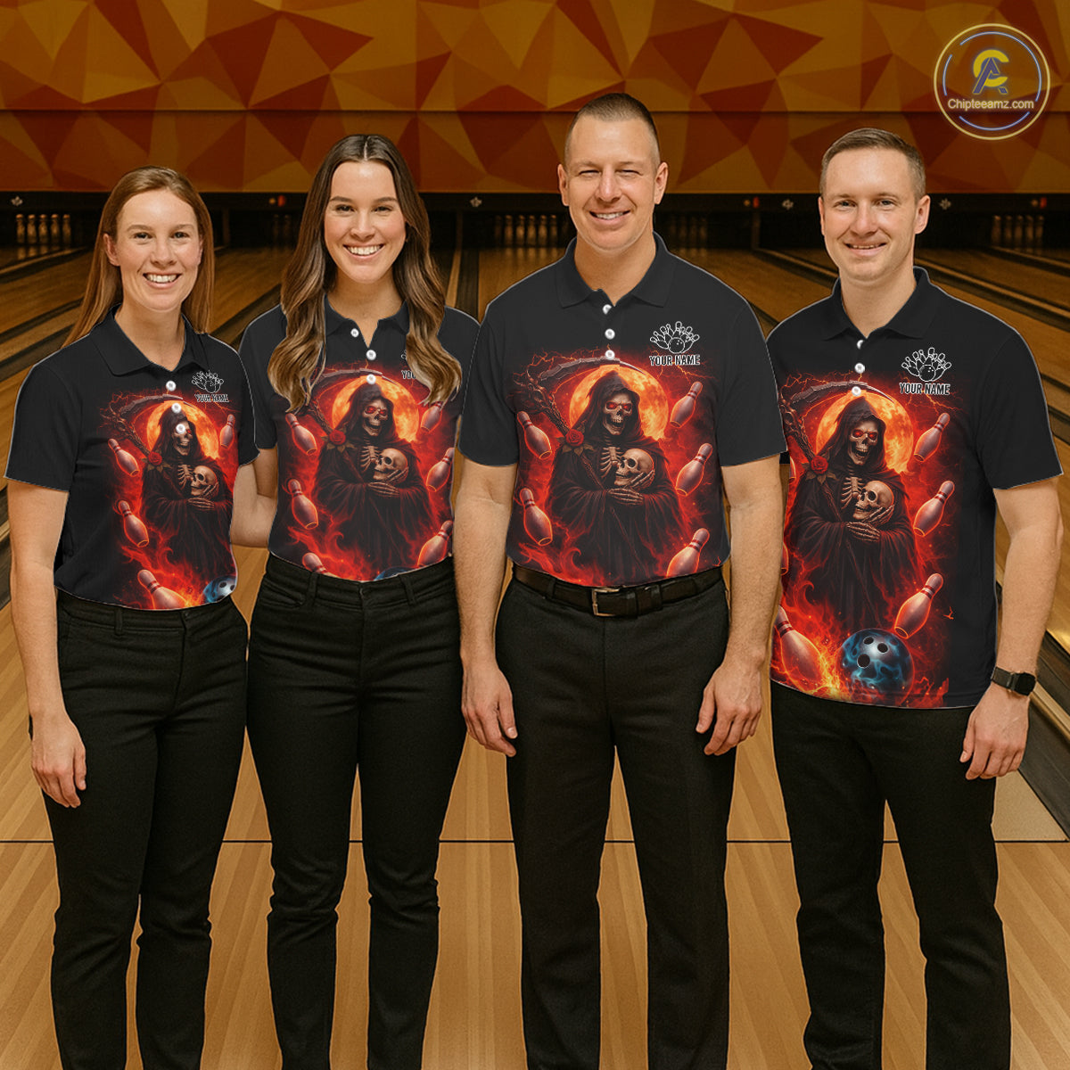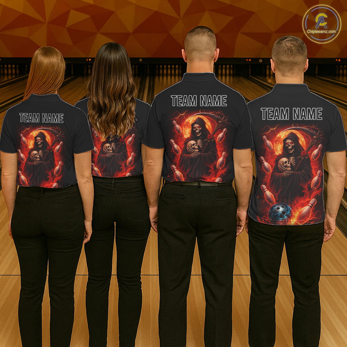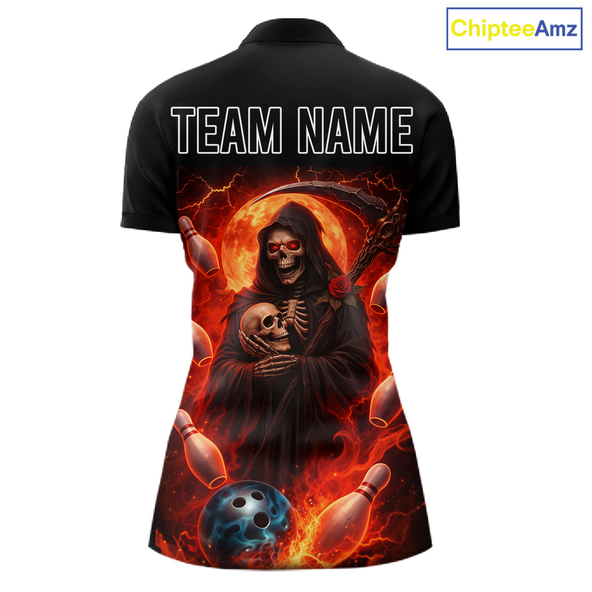 Black & Orange Lightning Thunder Moon Reaper Bowling Shirt For Women Custom Skull Team Bowling Jersey NQS11643