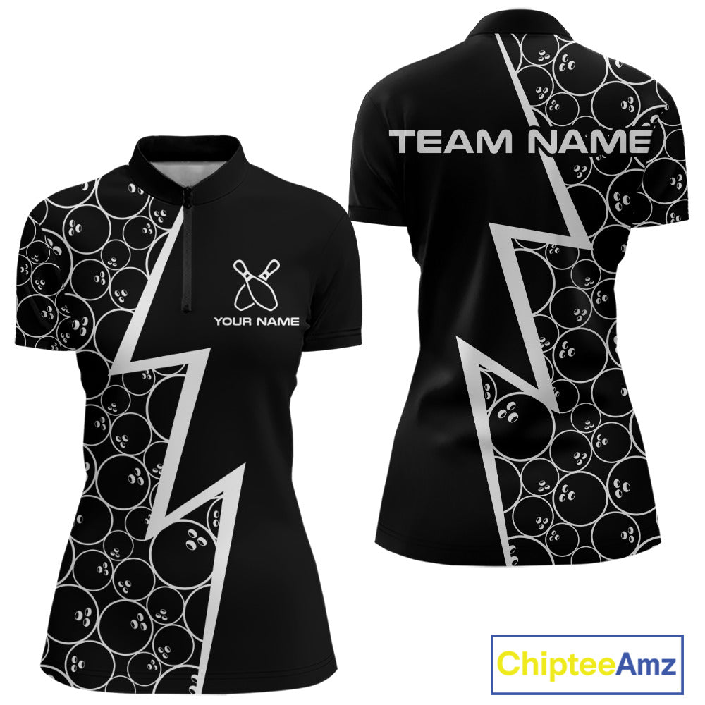 Black & White Lightning Camo Bowling Polo, Quarter Zip Shirt For Women Custom Team Bowling Jersey NQS10854