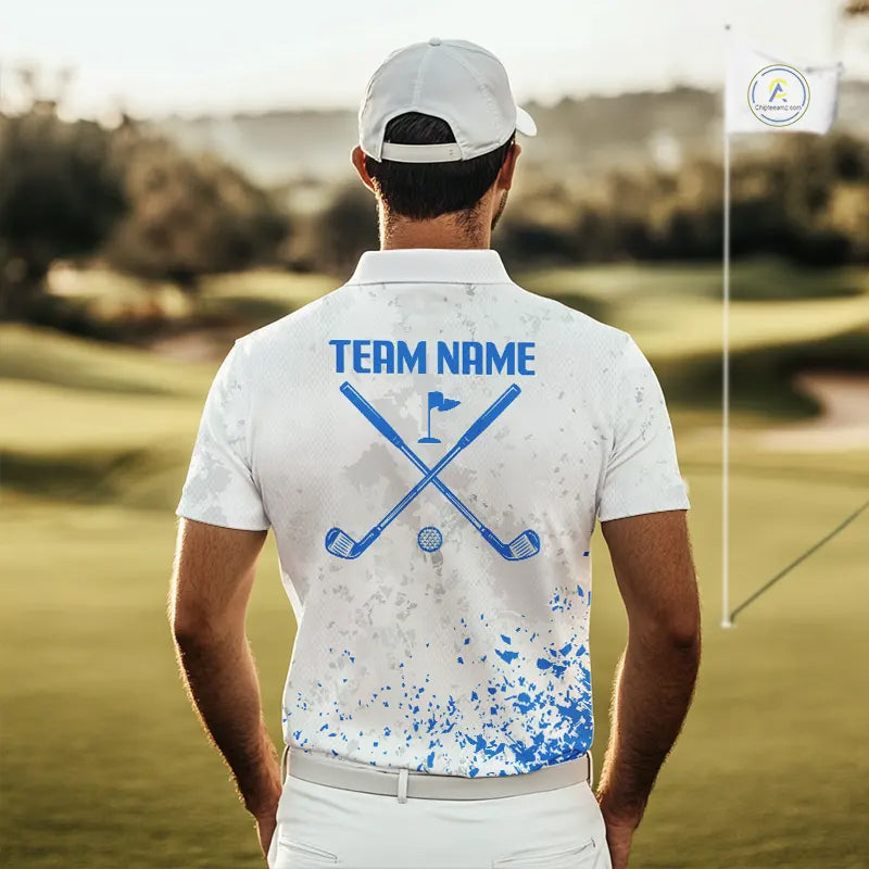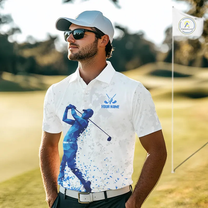 Blue And White Polygonal Pattern Mens Golf Polo Shirts Custom White Golf Clubs Golf Shirt For Men NHN0101
