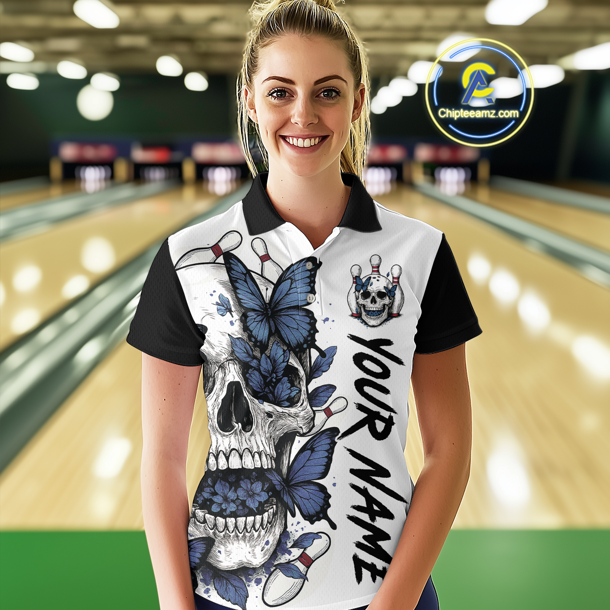 Blue Butterfly Skull Bowling Women Bowling Shirt Polo & Quarter-Zip Bowling Team Jerseys HNT80