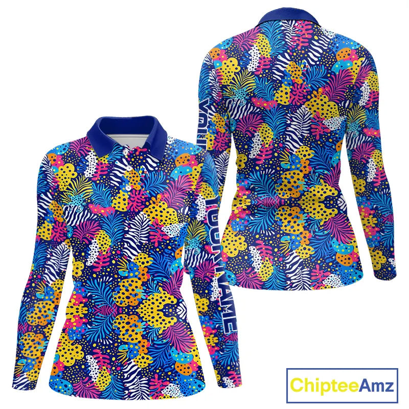 Colorful Paisley Pattern Womens Long Sleeve Golf Polo Shirt Custom Tropical Golf Attire For Ladies NHN0147