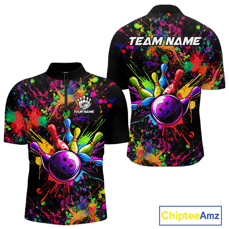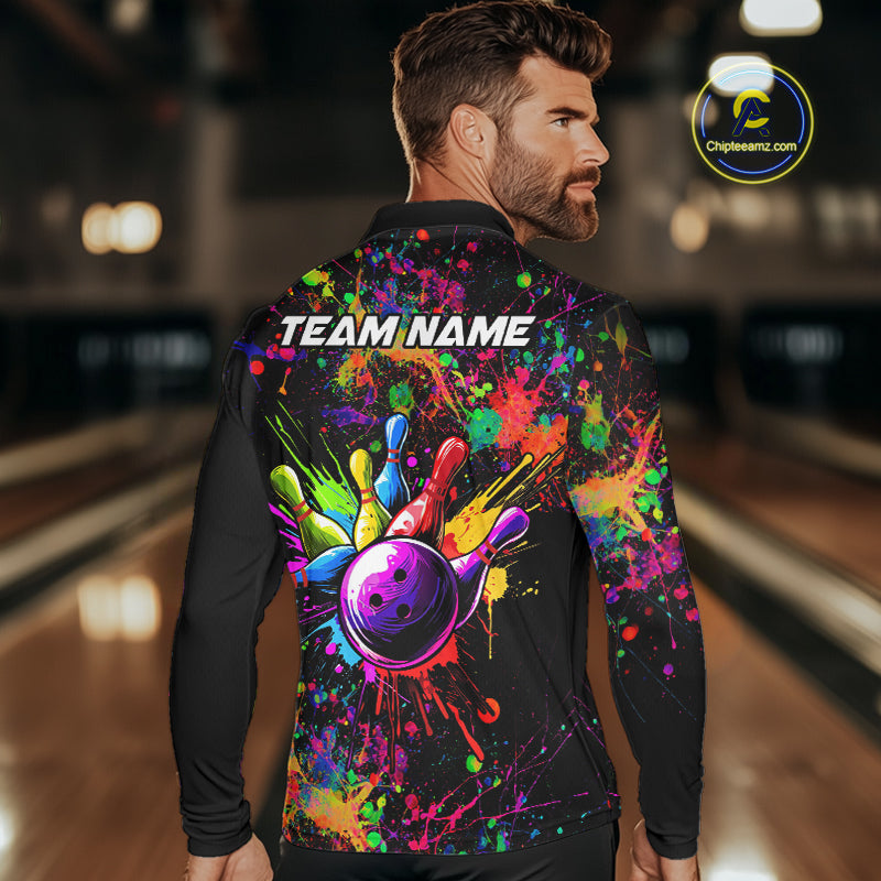 Colorful watercolor Bowling Polo, 1/4 Zip Shirt for mens Custom Bowling Team jersey for bowlers NQS10242
