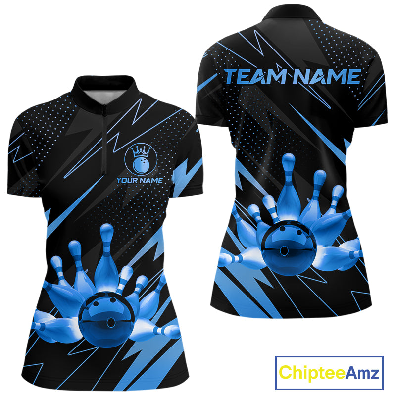 Custom Black and Blue Bowling Polo, Quarter Zip Shirts for Women, Team Bowling League Jersey NQS10892