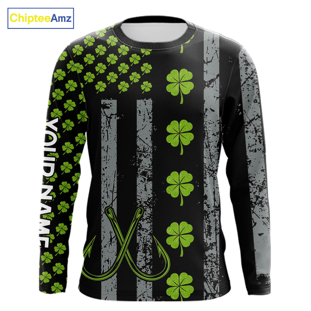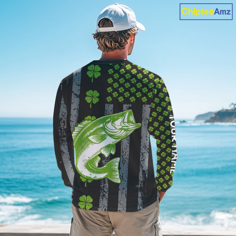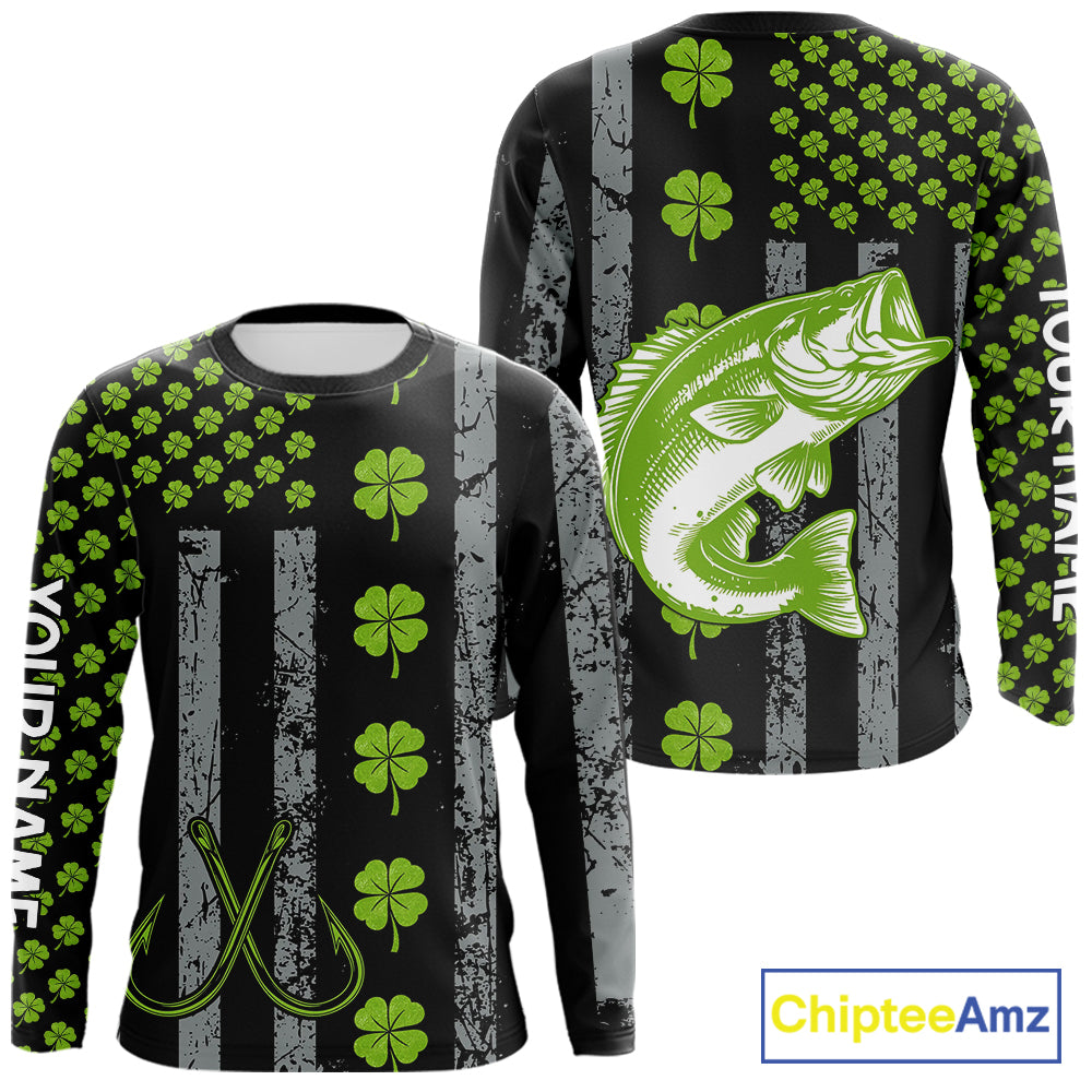 Custom Black Grunge US Flag Green Shamrock St Patrick Largemouth Bass Fishing Shirts, Bass Jerseys NQS11451