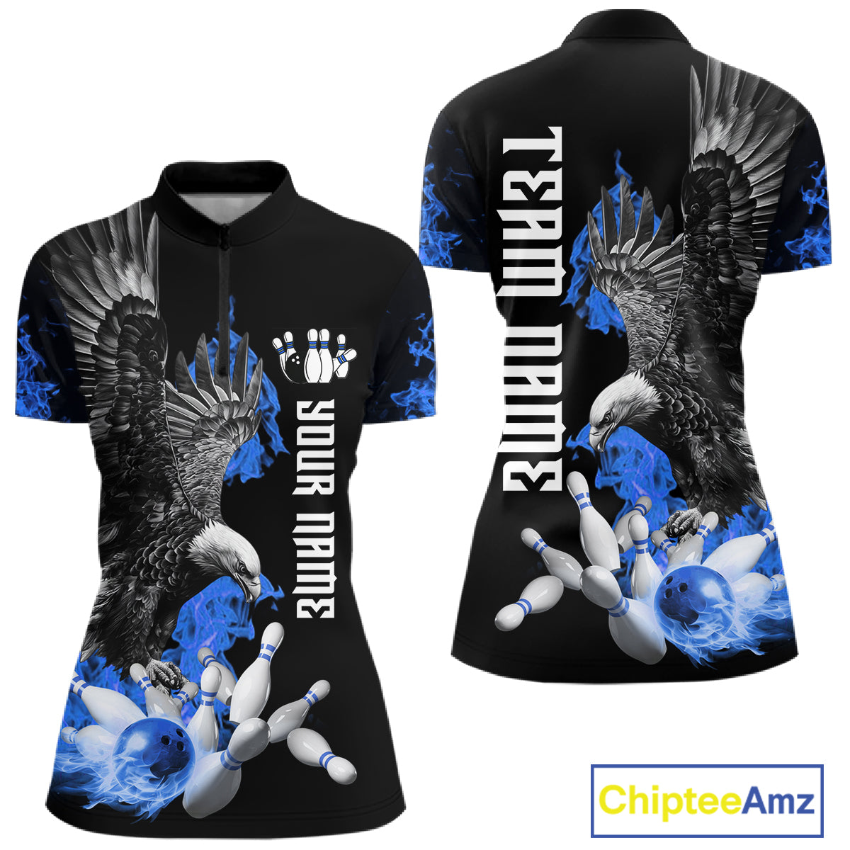 Custom Blue Flame Black Eagle Bowling Polo, Quarter Zip Shirt For Women, Team Bowling Clothes NQS11501