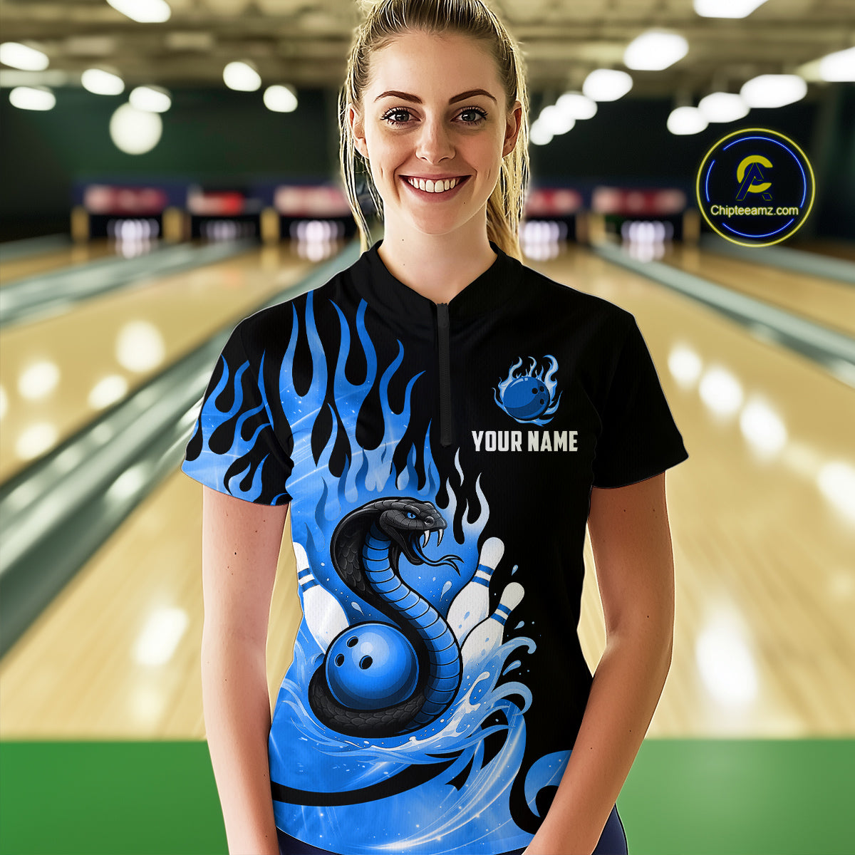 Custom Blue Flame Cobra Snake Bowling Shirt Quarter-Zip Bowling Team League Bowling Jersey QZT694