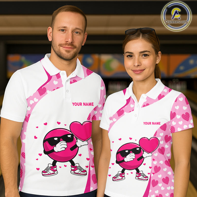 Custom funny bowling ball pink heart pattern matching bowling shirts for couples, Valentine gifts NQS11325