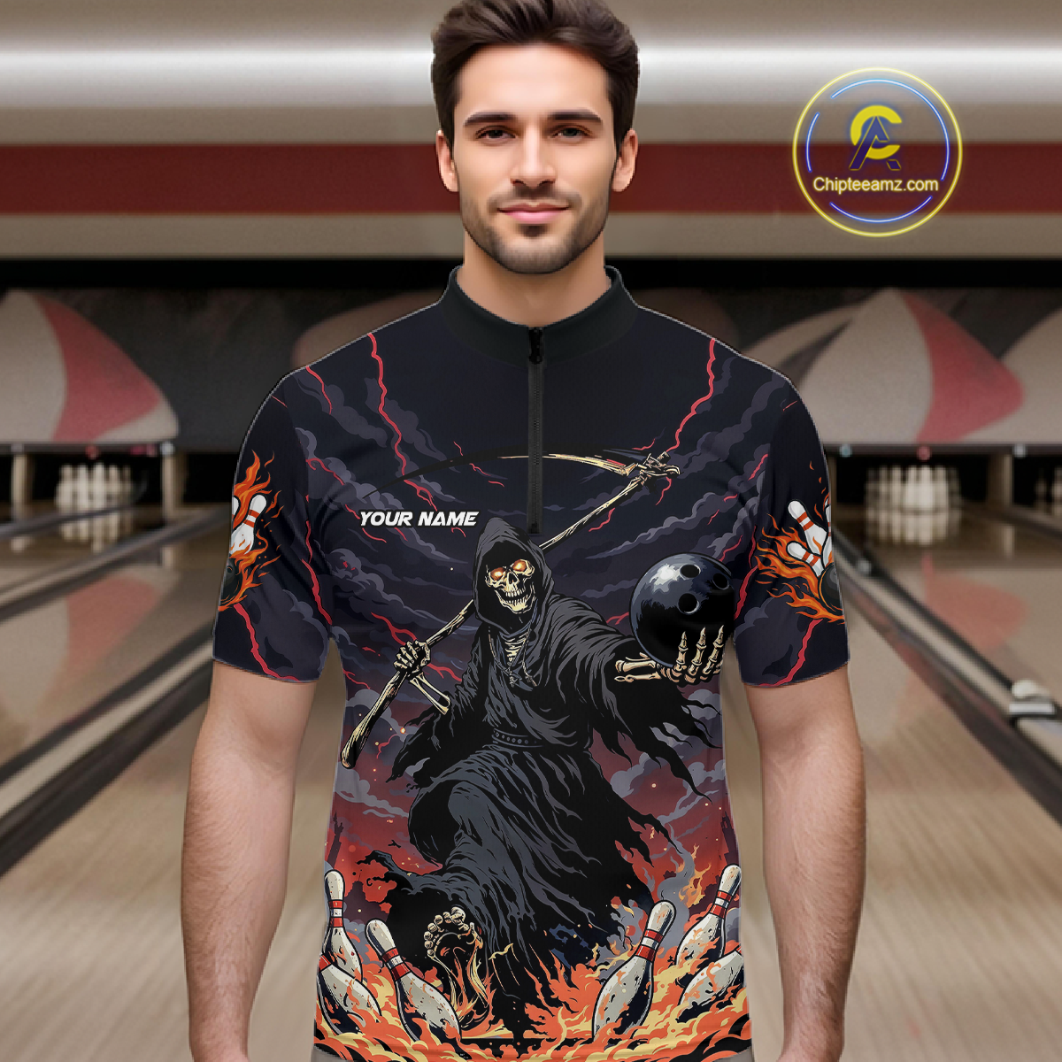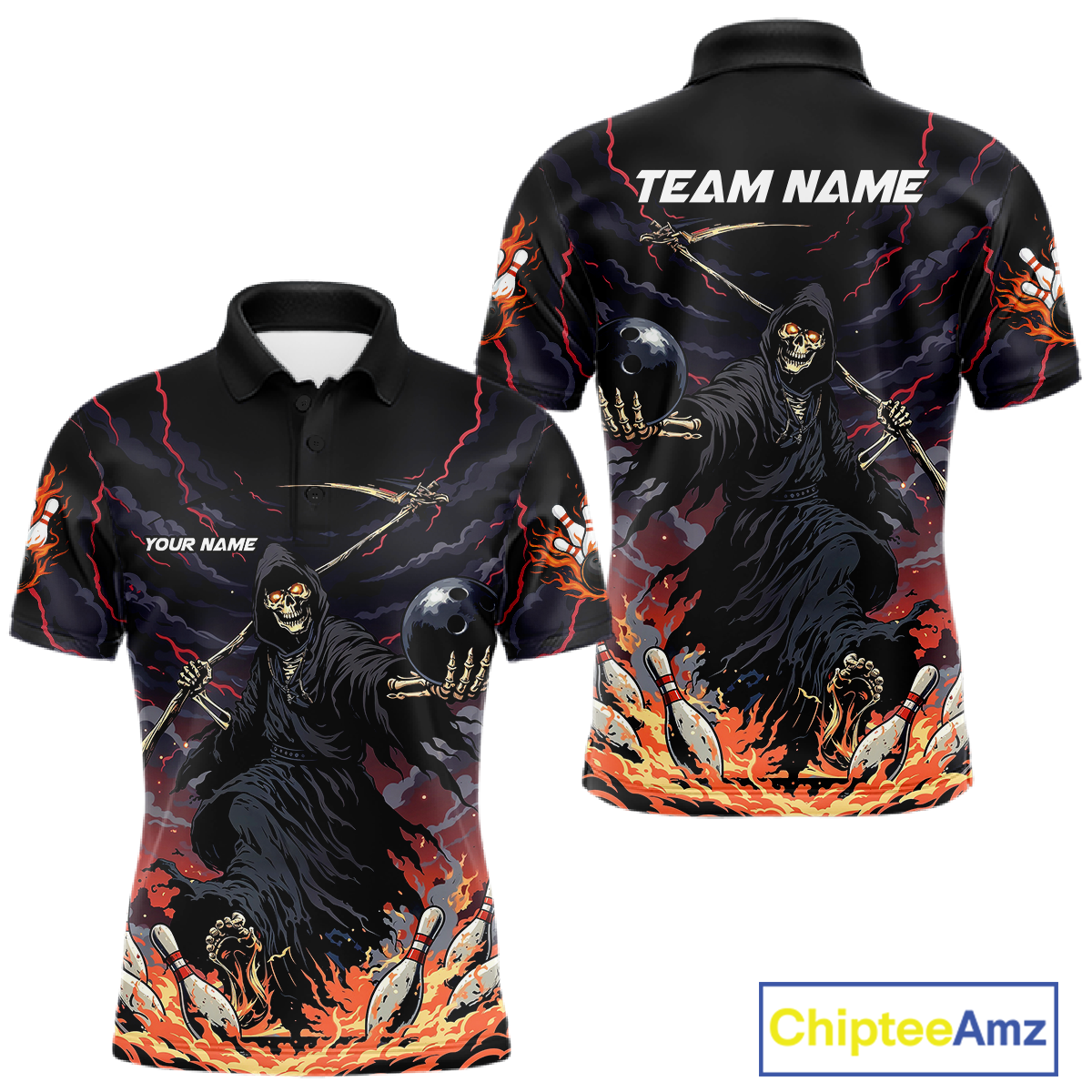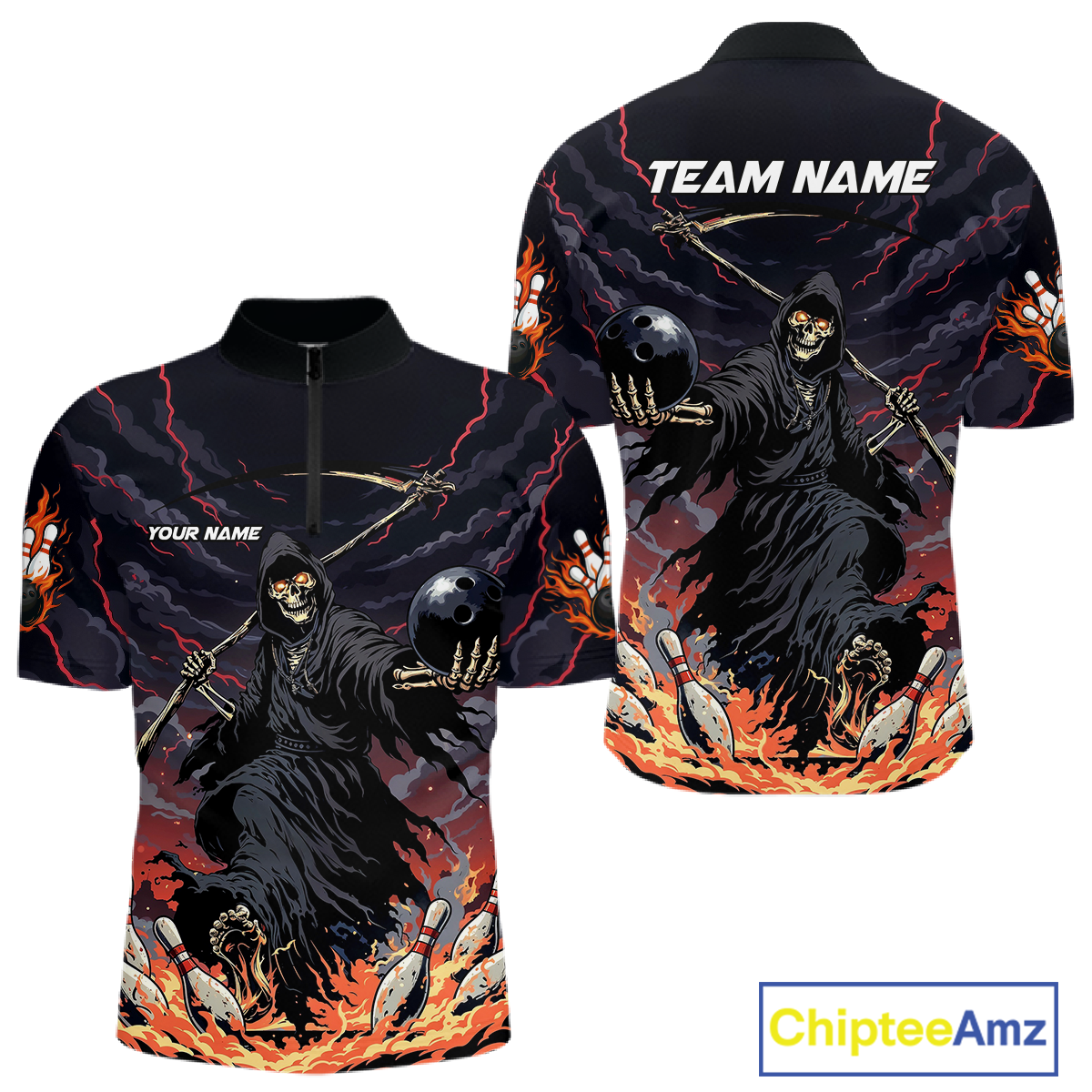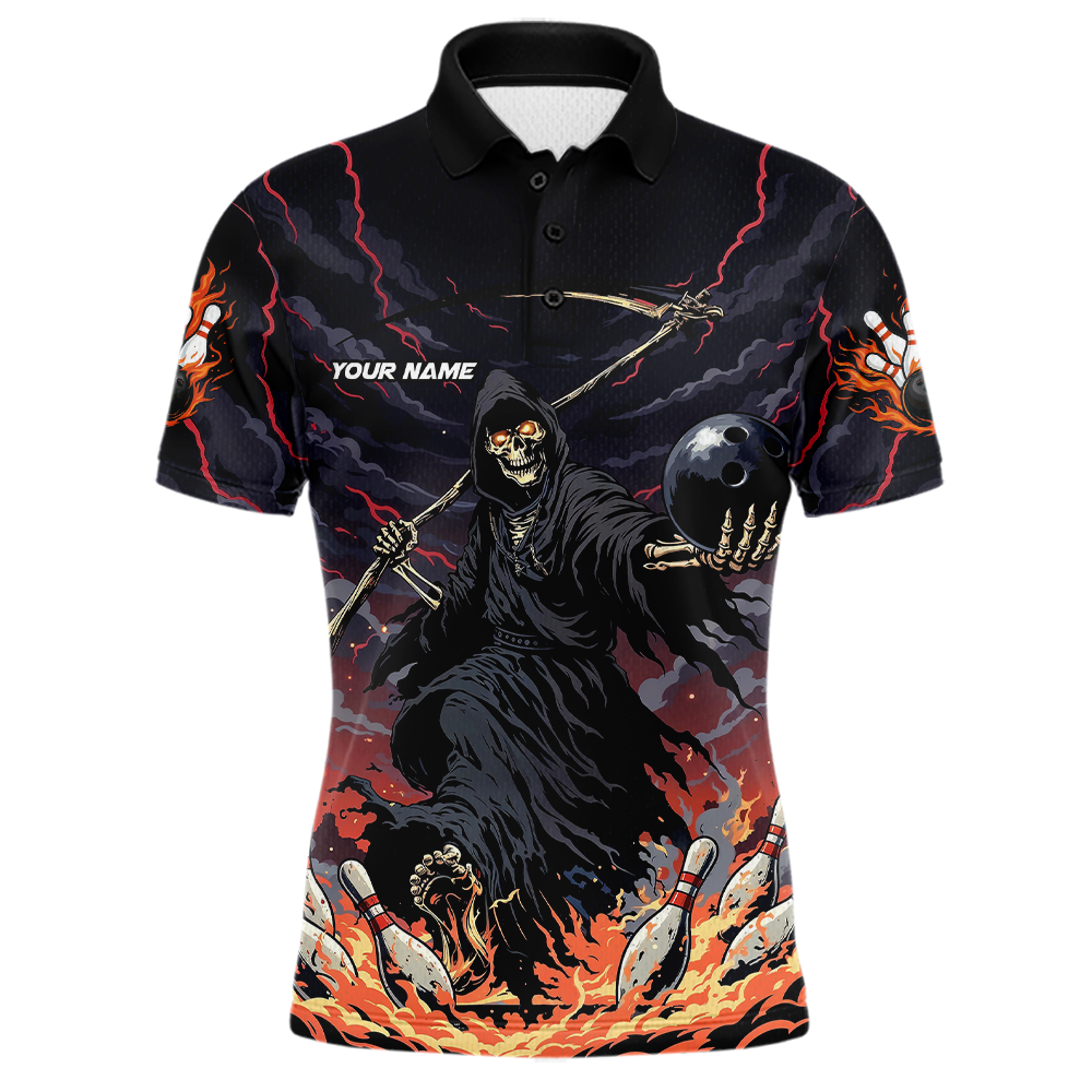 Custom Grim Reaper Flame Bowling Jersey for Men Bowling Team Shirts Polo & 1/4 Zip HNT193