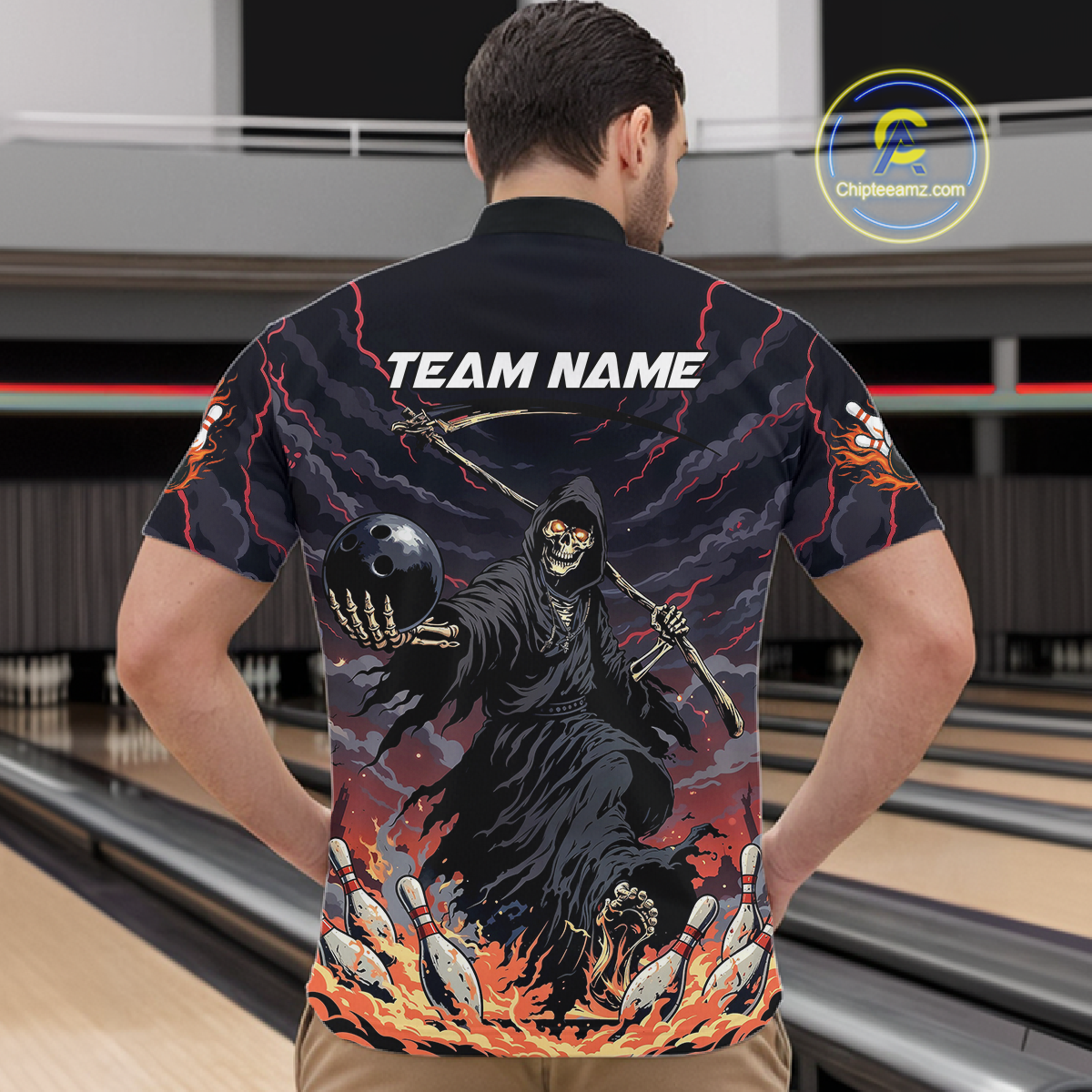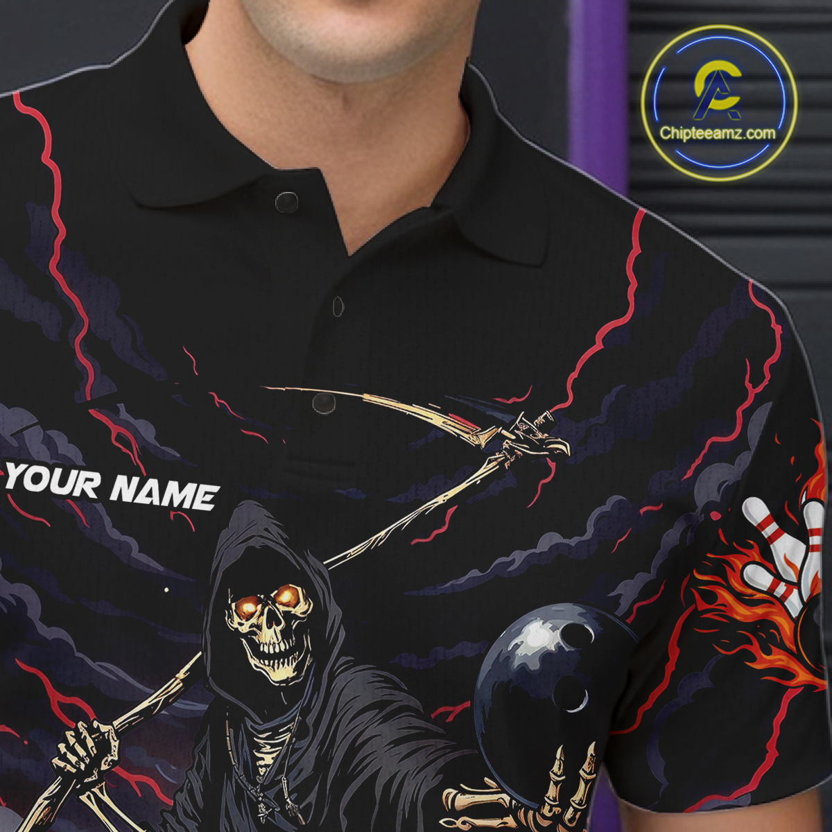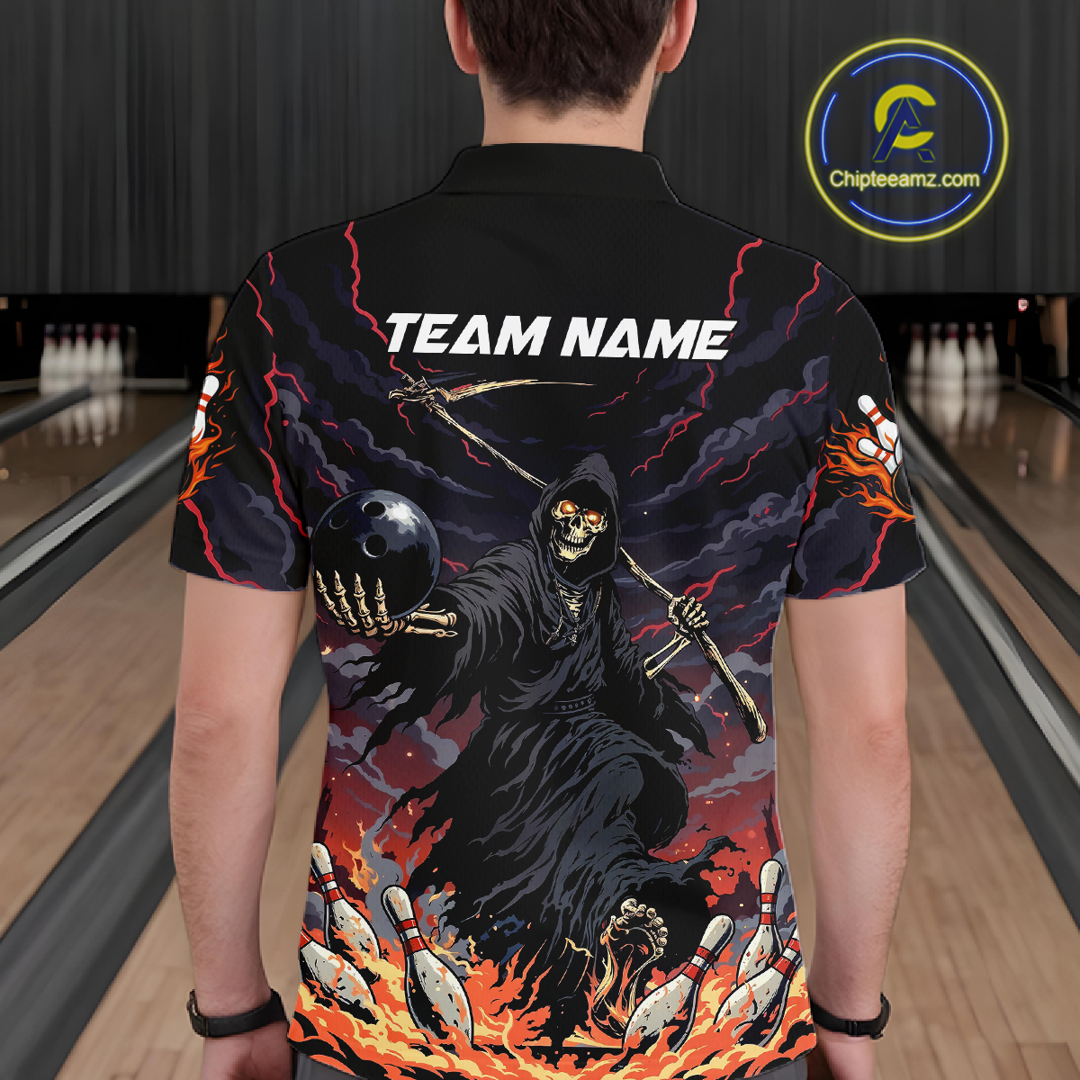 Custom Grim Reaper Flame Bowling Jersey for Men Bowling Team Shirts Polo & 1/4 Zip HNT193
