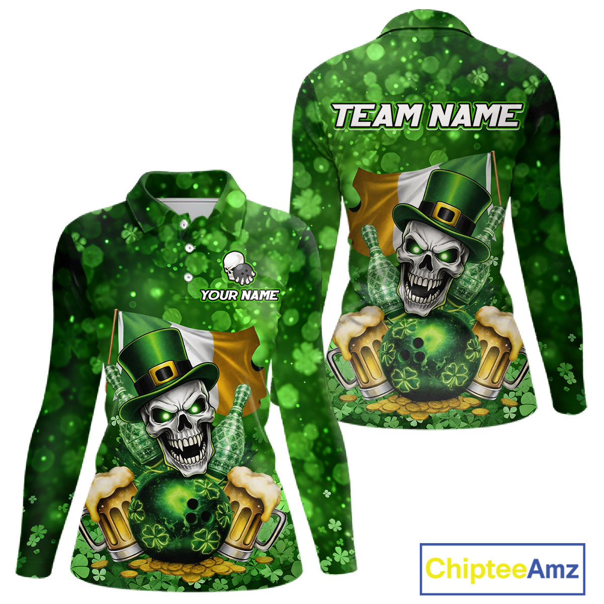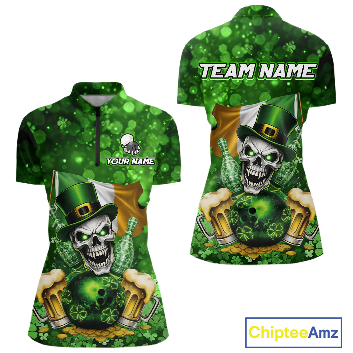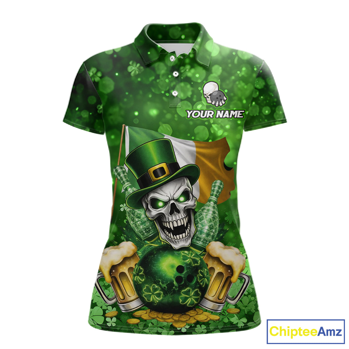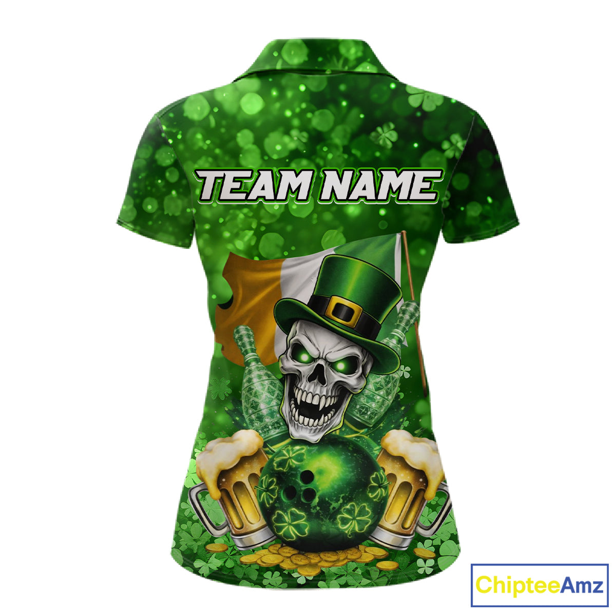 Custom Funny Skull Bowling and Beer Ireland Flag Green St Patrick Team Bowling Jerseys For Women NQS11484