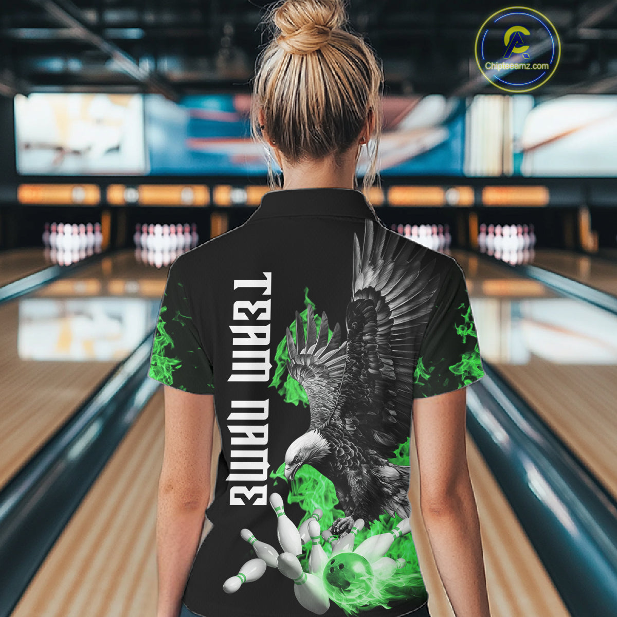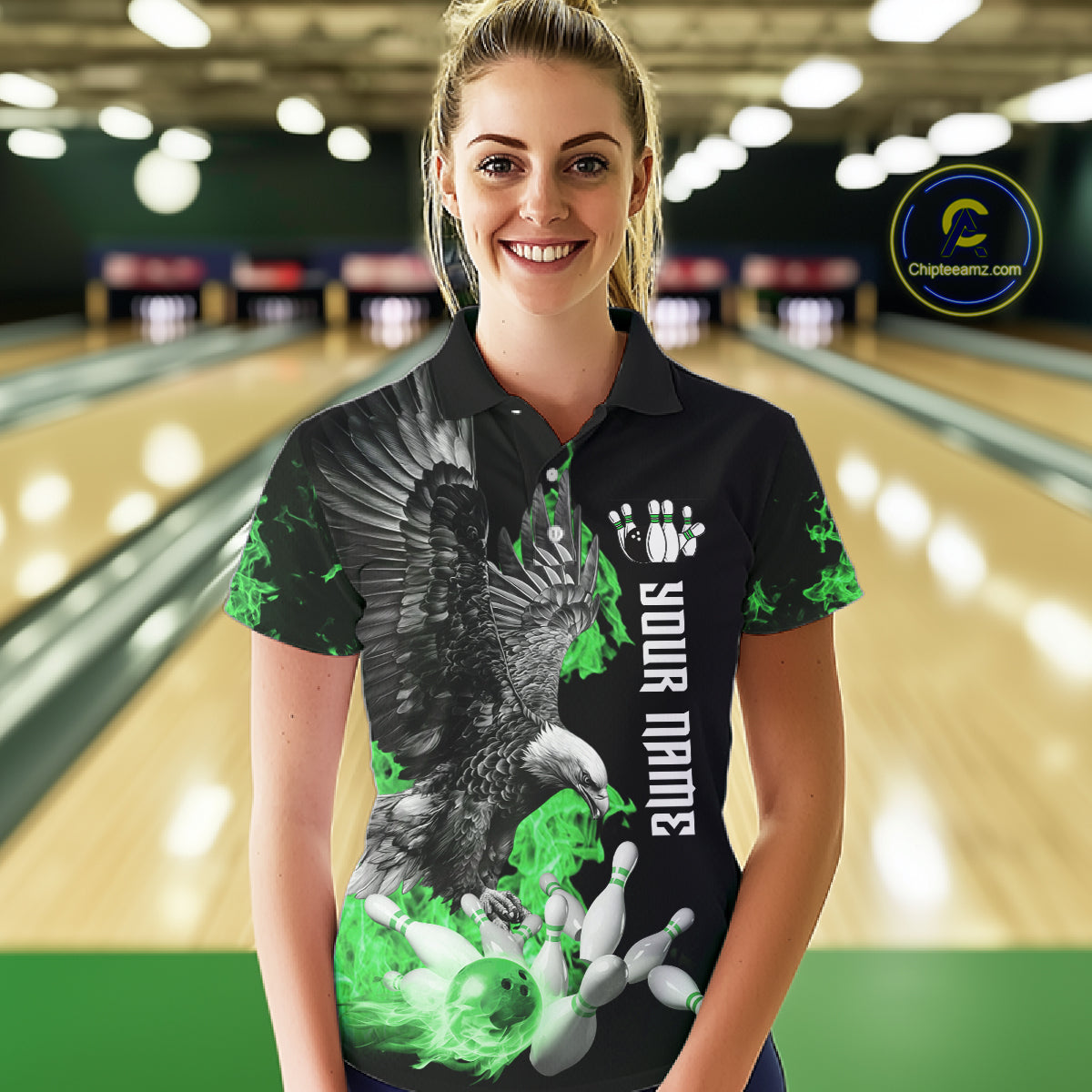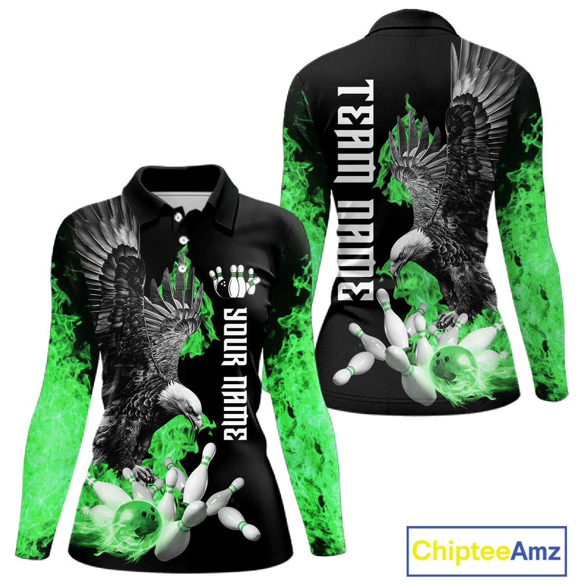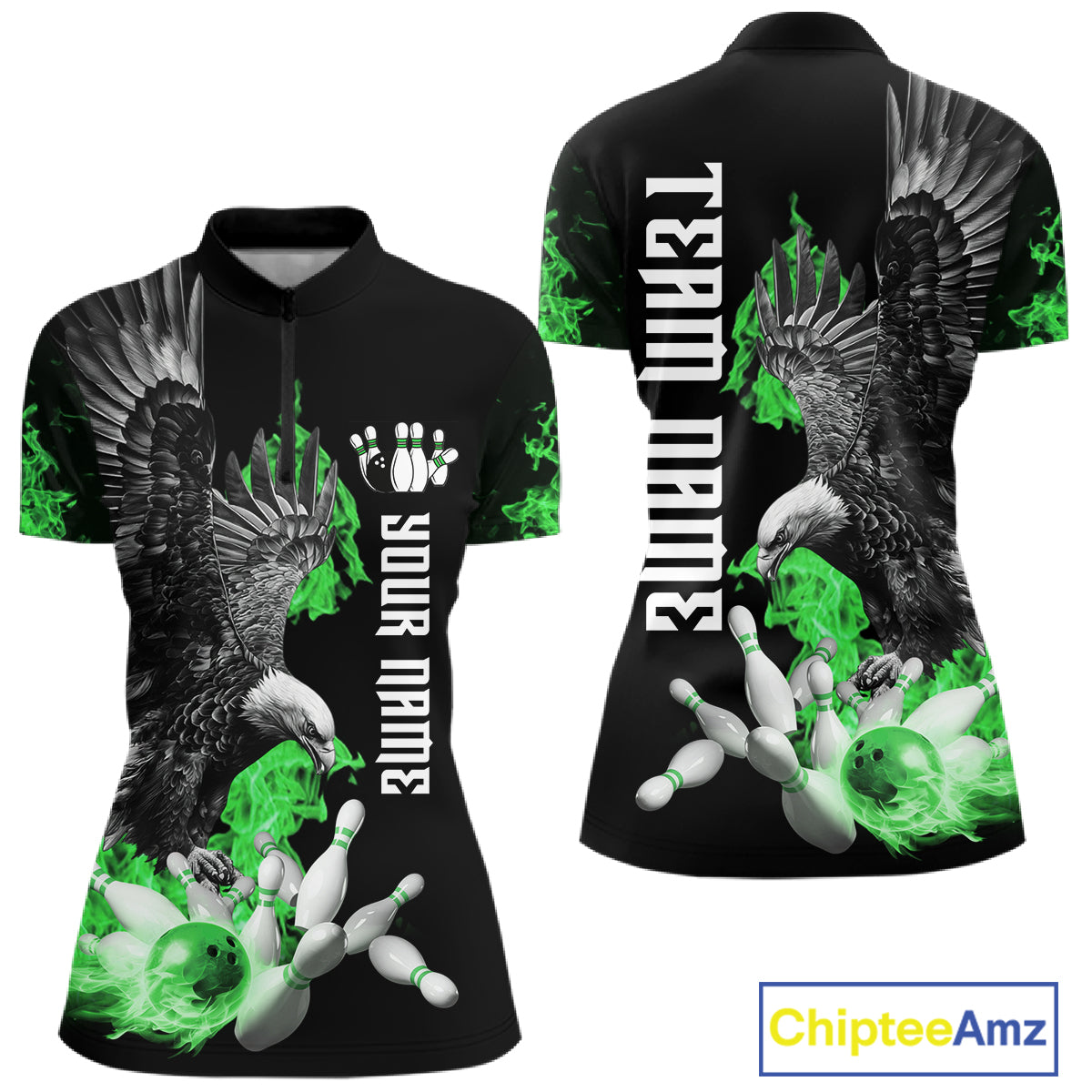 Custom Green Flame Black Eagle Bowling Polo, Quarter Zip Shirt For Women, Team Bowling Clothes NQS11502