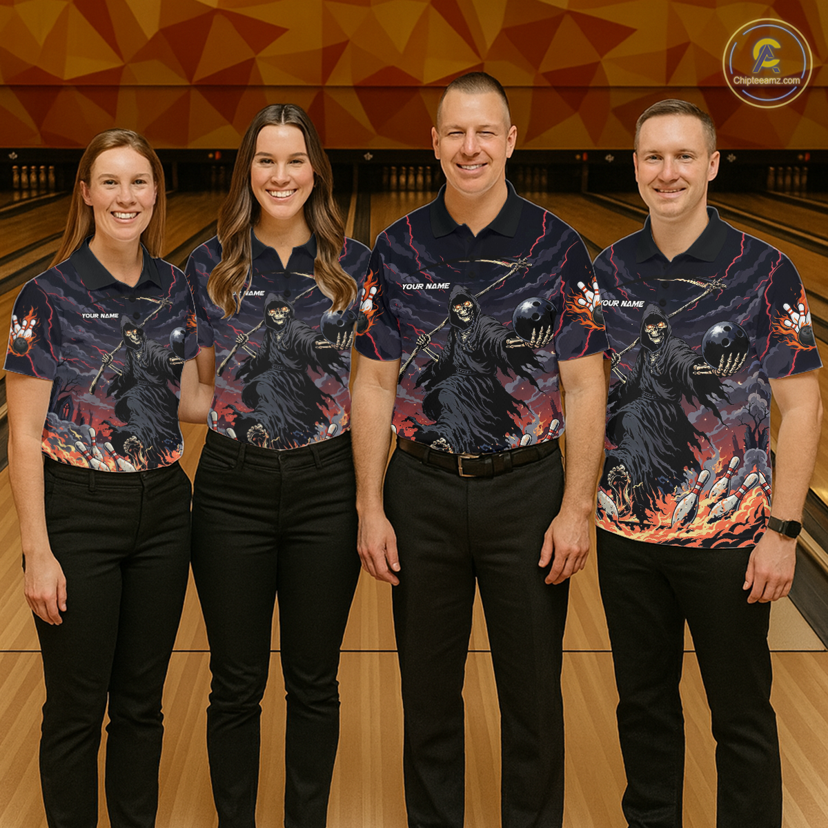 Custom Grim Reaper Flame Bowling Jersey for Women Bowling Team Shirts Polo & 1/4 Zip HNT193